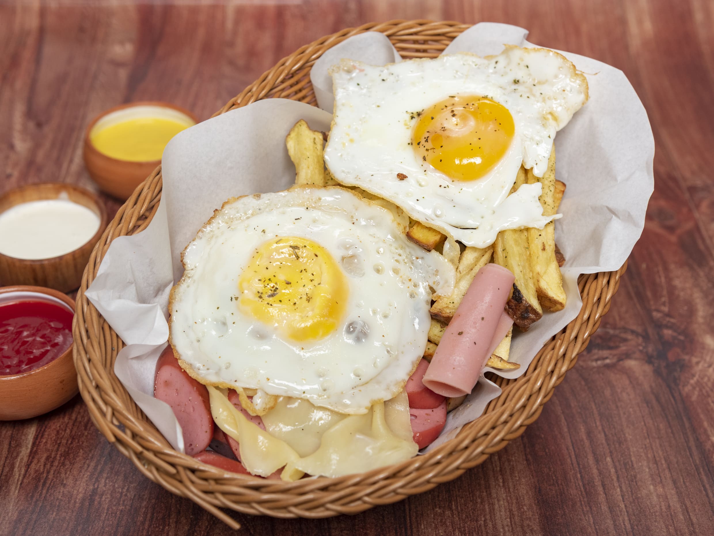 Salchicha frankfurter, 2 huevos, tocino, doble queso derretido y jamón.
