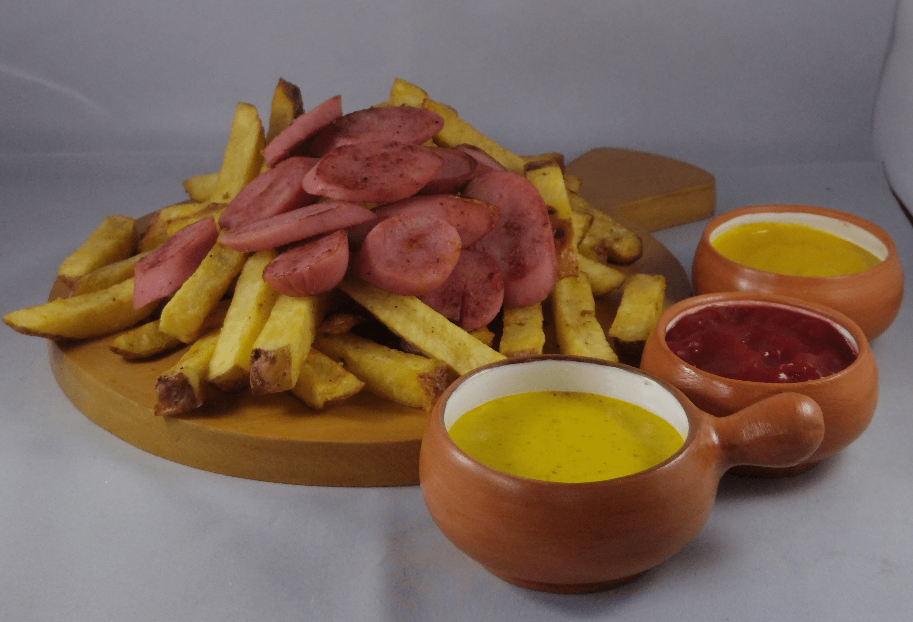 Salchipapa hecha a base de Salchicha Frankurter + Abundantes y Crocantes papitas fritas + Salsas a elección + Bebida