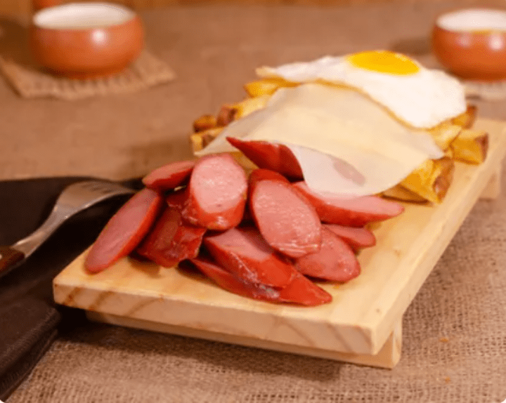 Salchipapa hecha a base de salchicha frankfurter, queso derretido y huevo.