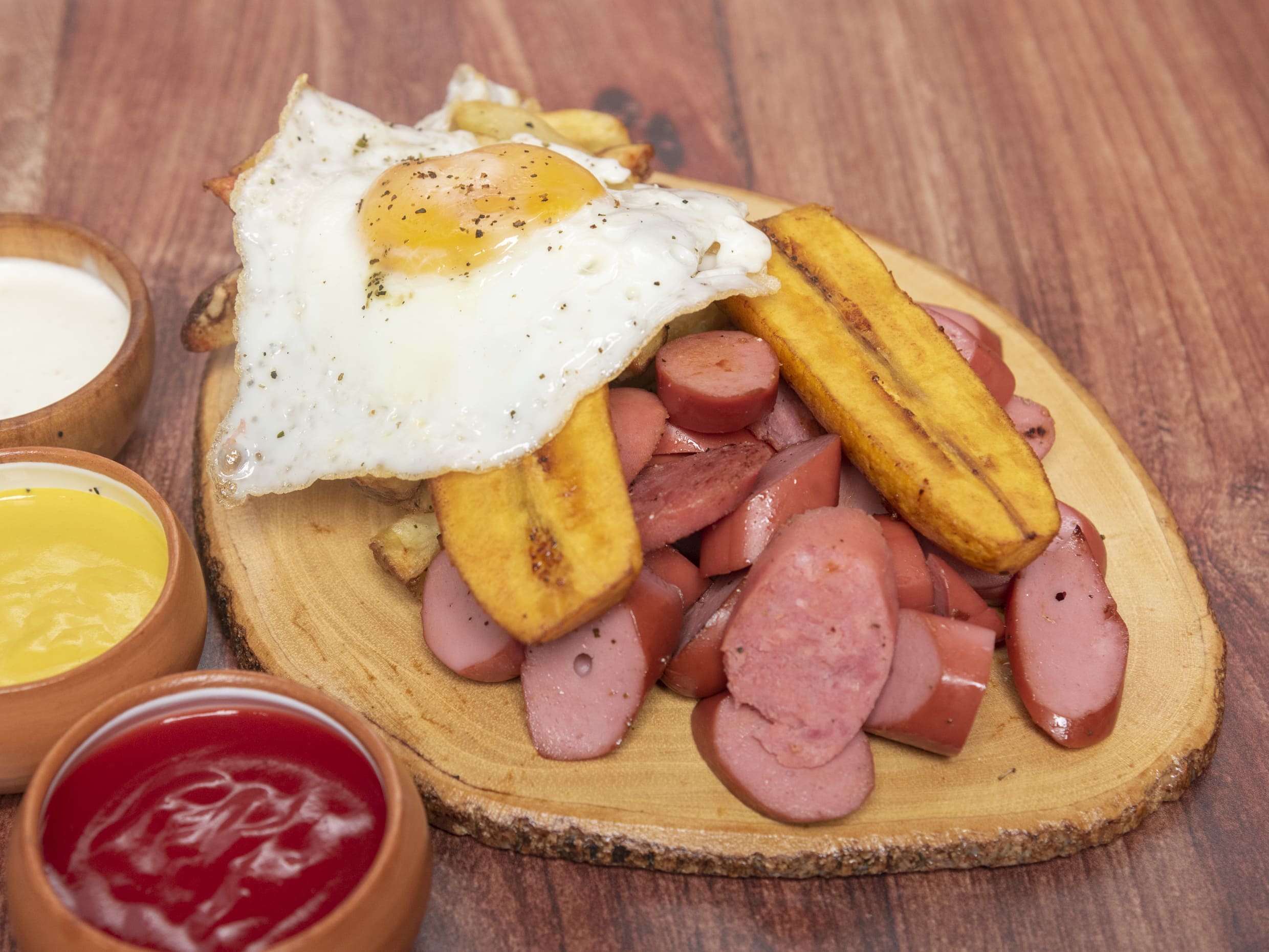 Salchipapa hecha a base de salchicha frankfurter, huevo y plátano frito.