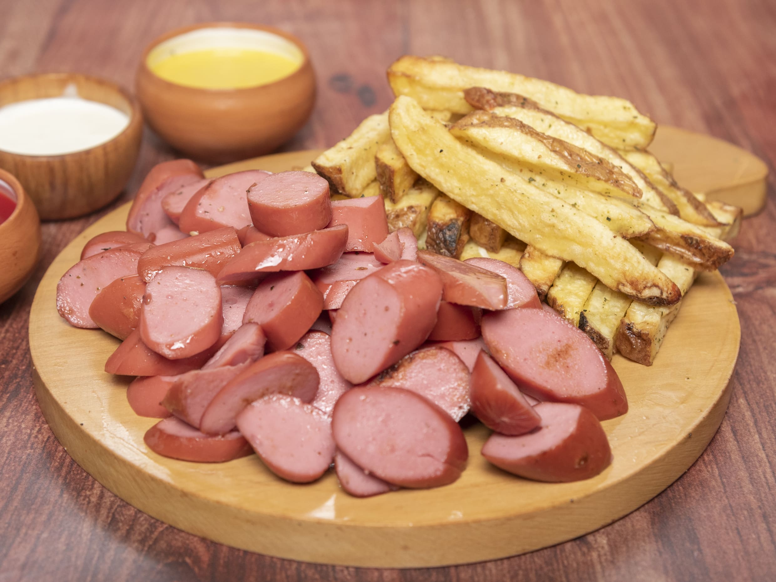 Salchipapa hecha a base de salchicha frankfurter, chorizo criollo y crocantes.