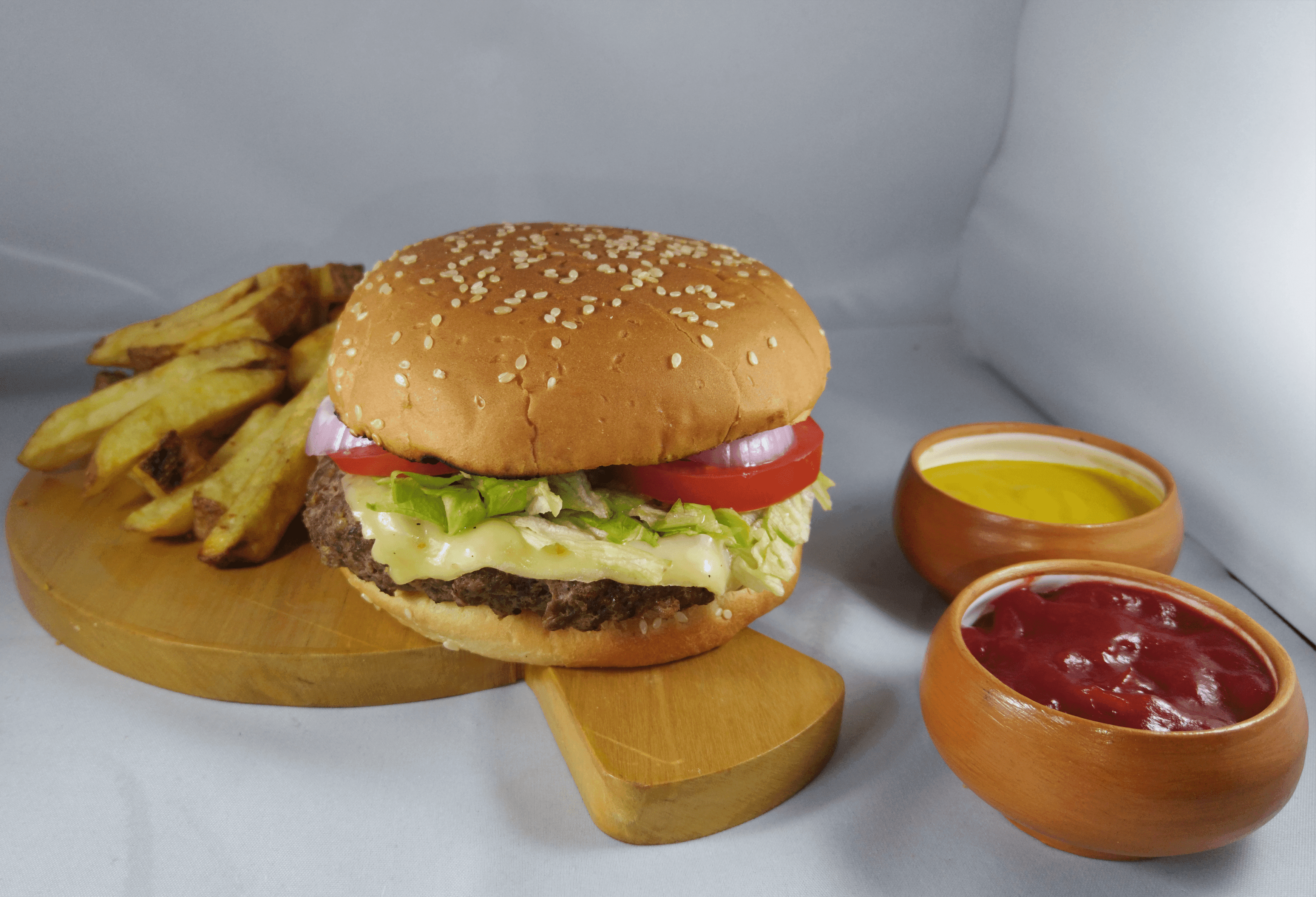 Hamburguesa clásica, queso gouda derretido y vegetales frescos.