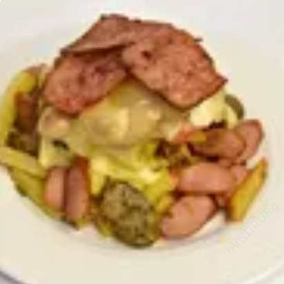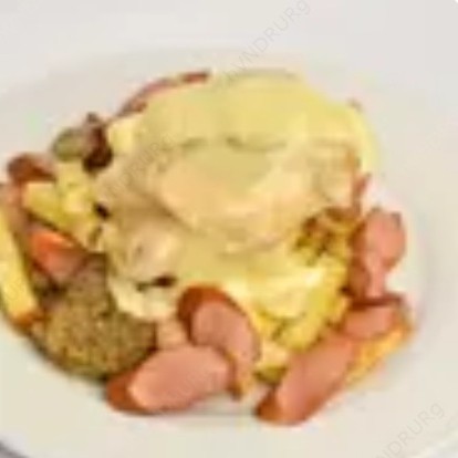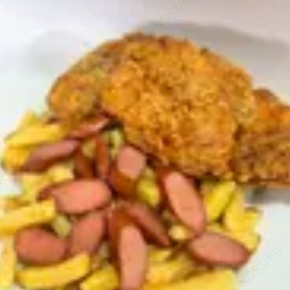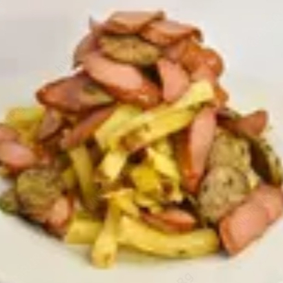 Papas fritas con salchicha, chorizo, huevo y pollo.