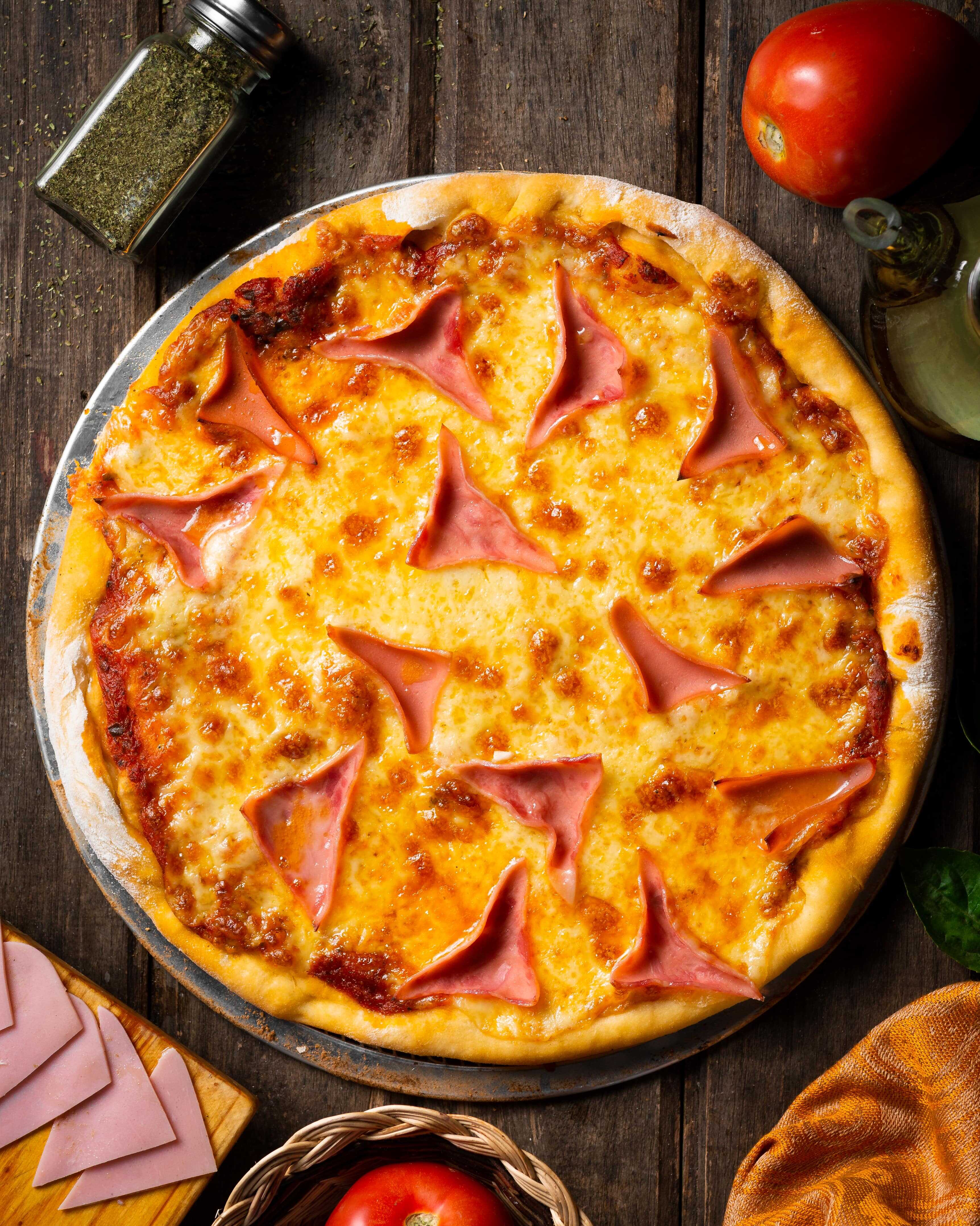 Salsa marinera con queso mozzarella, jamón y piña.