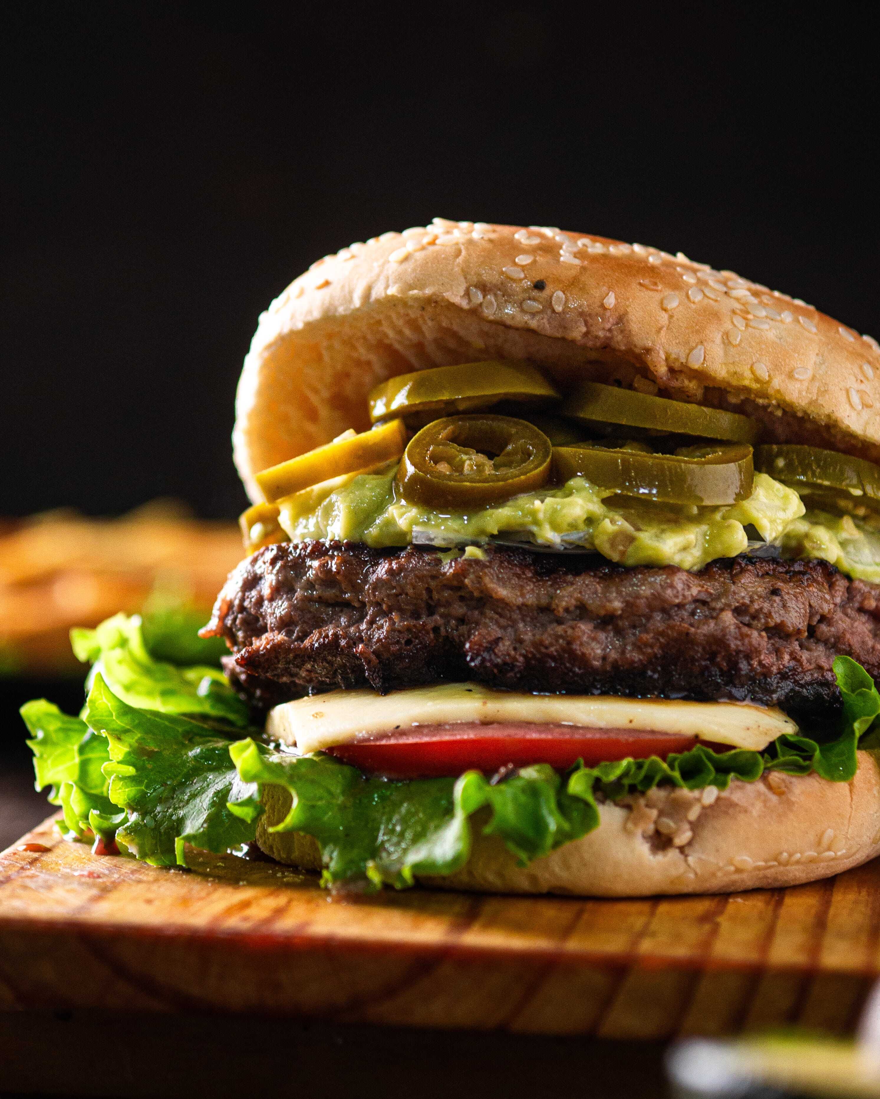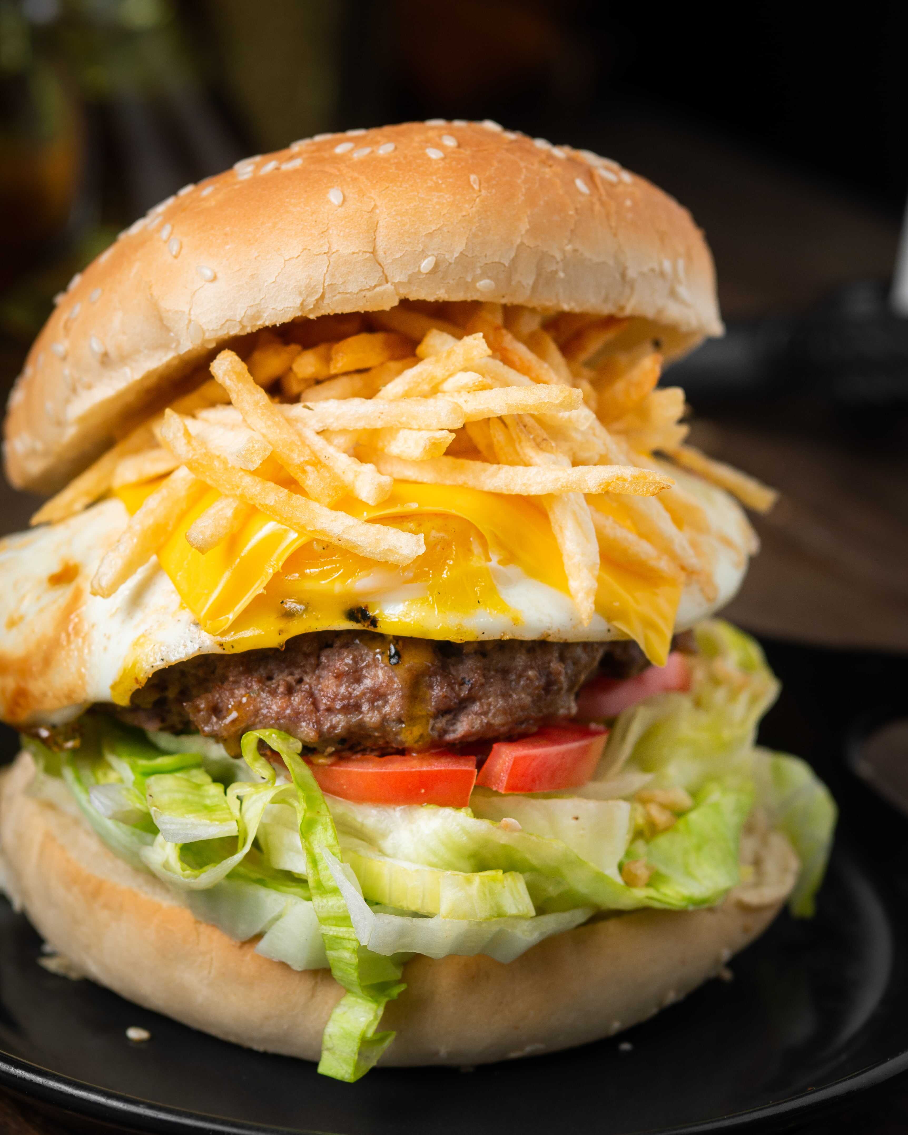 Pan, hamburguesa, lechuga, tomate, guacamole, frejoles negros, jalapeños y papas al hilo.