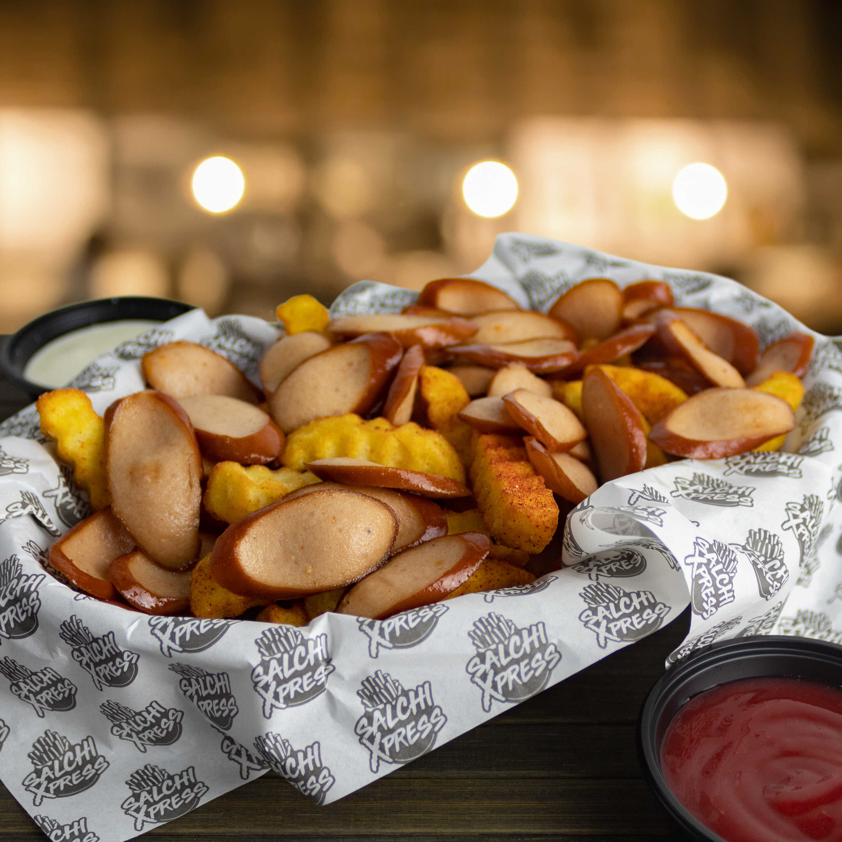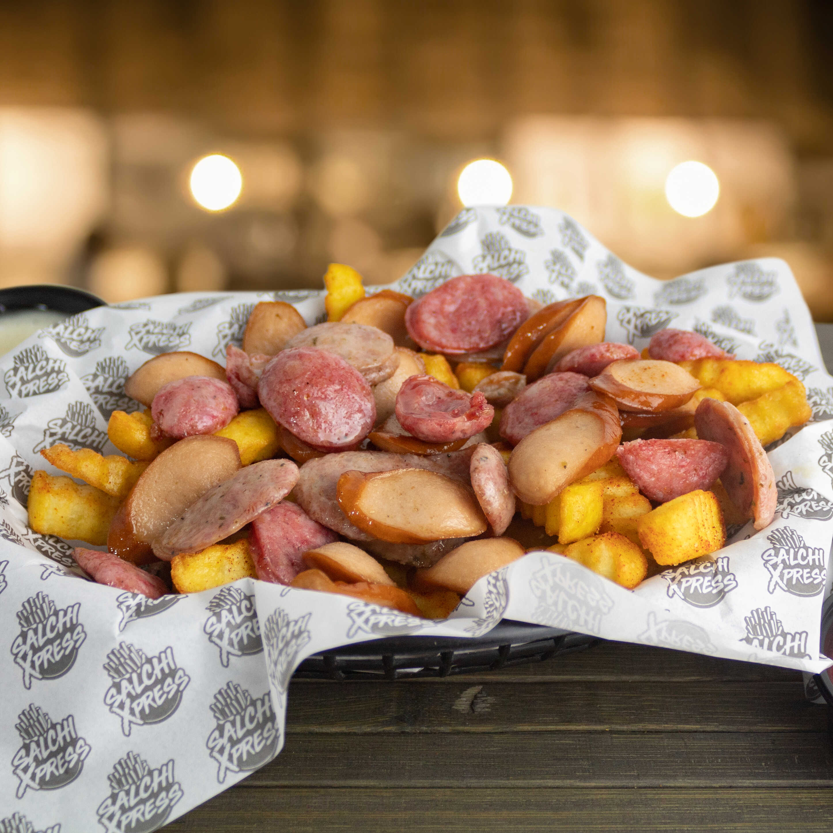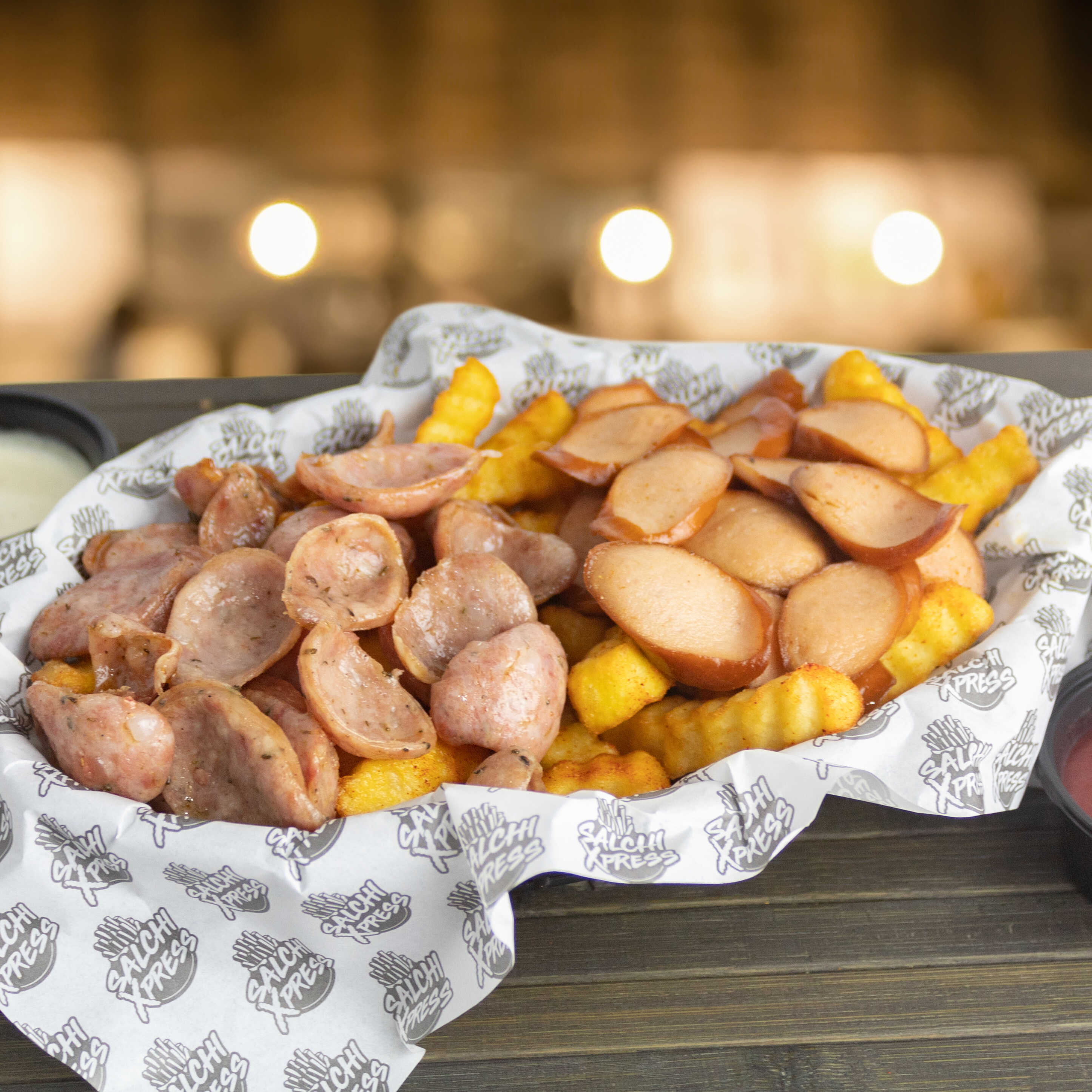 Salchipapa a base de papas fritas con salchichas frankfurter, chorizo parrillero, chorizo a las finas hierbas, cremas y tamaño a elegir.