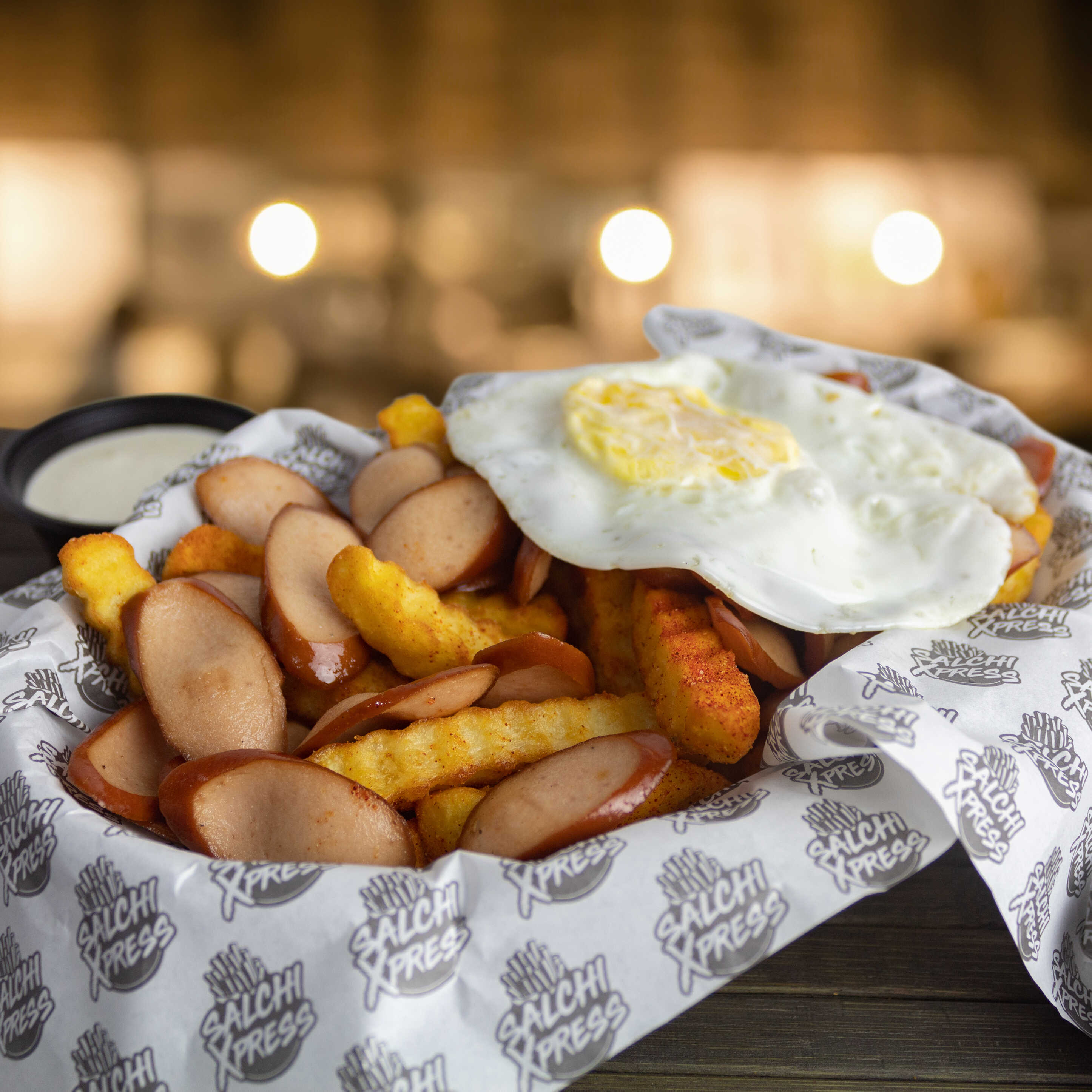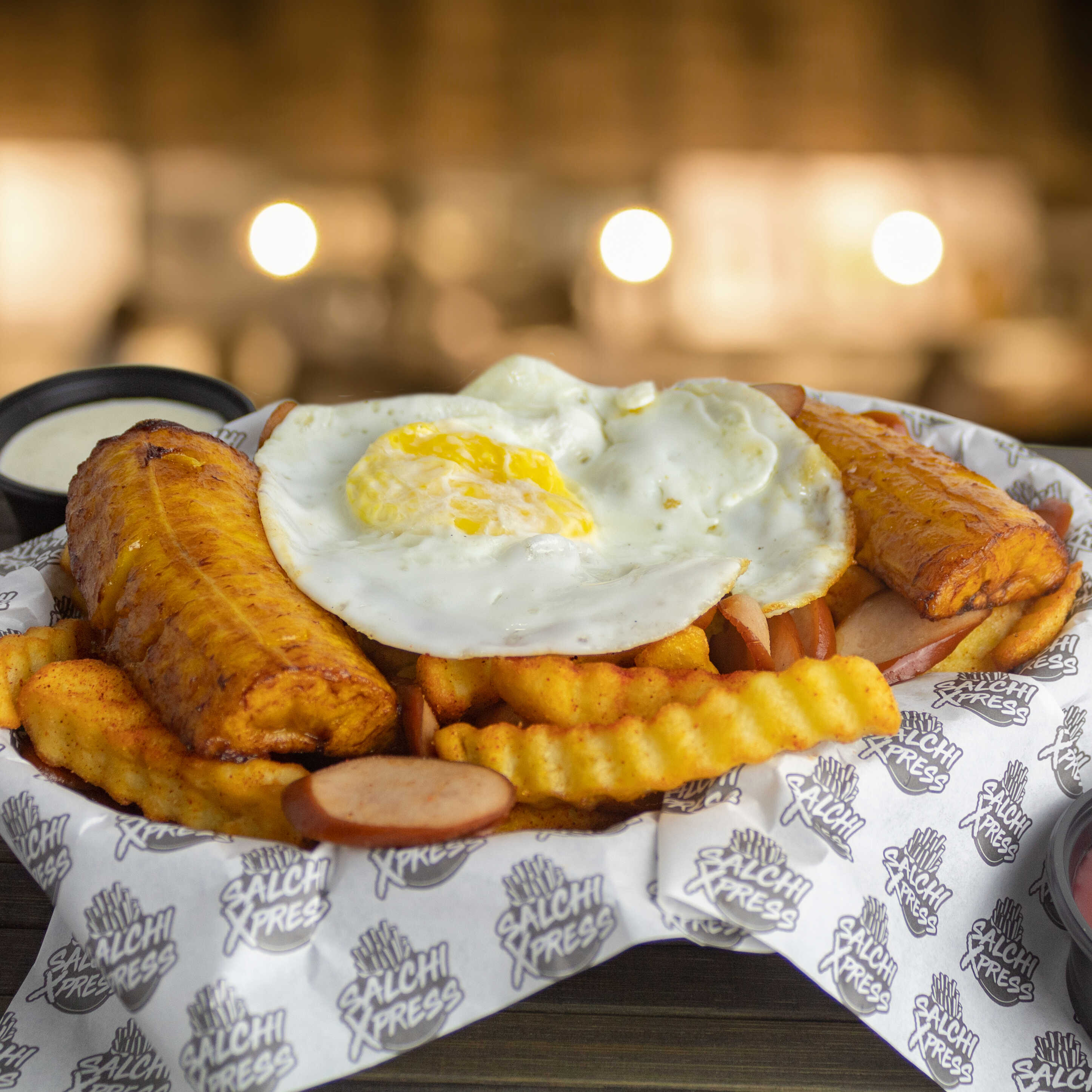 Salchipapa a base de papas fritas con salchicha frankfurter, plátano, huevo frito, cremas y tamaño a elegir.