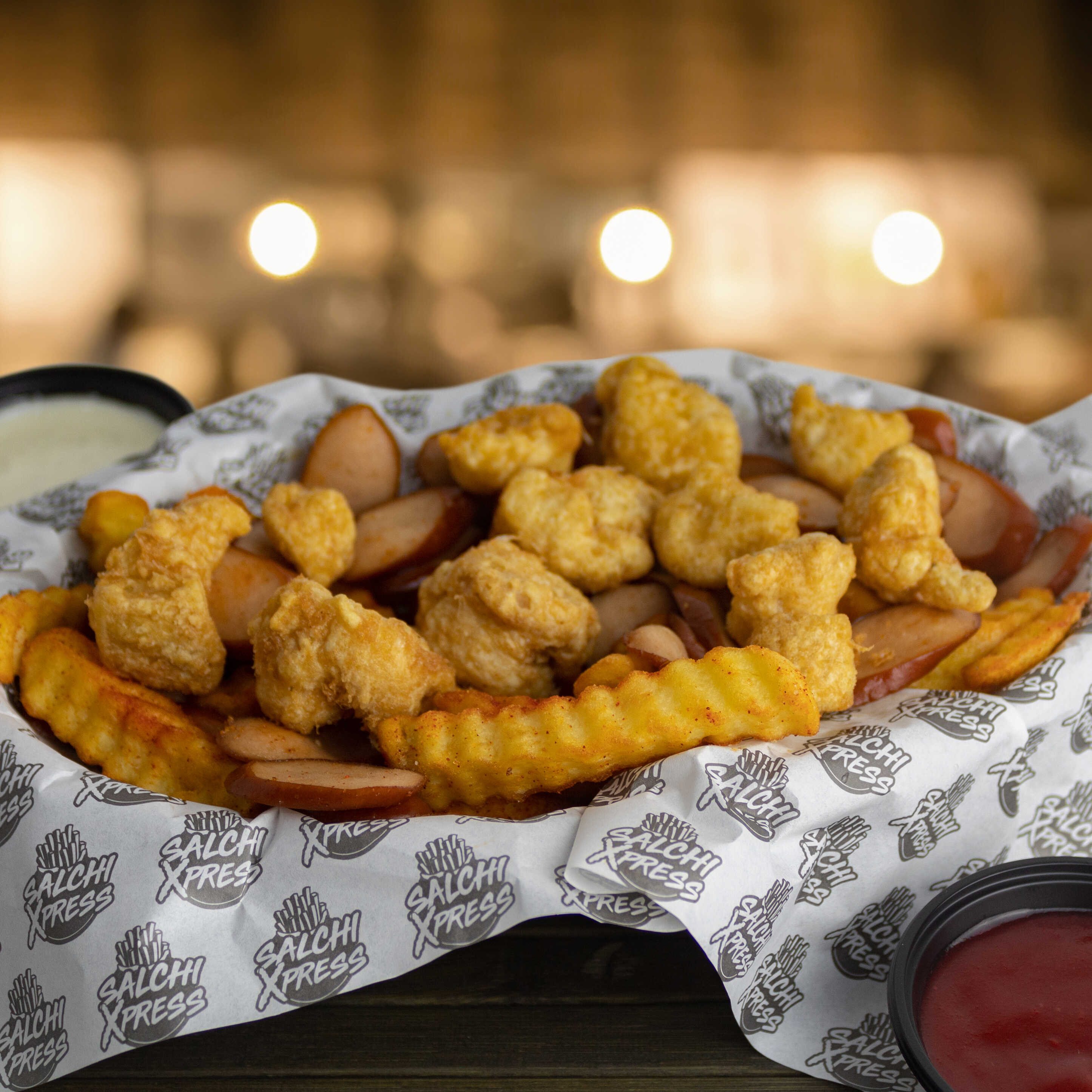 Salchipapa a base de papas fritas con salchicha frankfurter, chicken pops, cremas y tamaño a elegir.