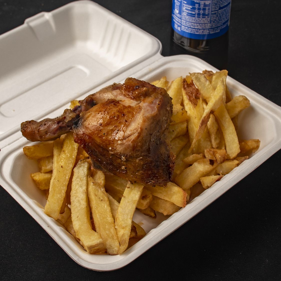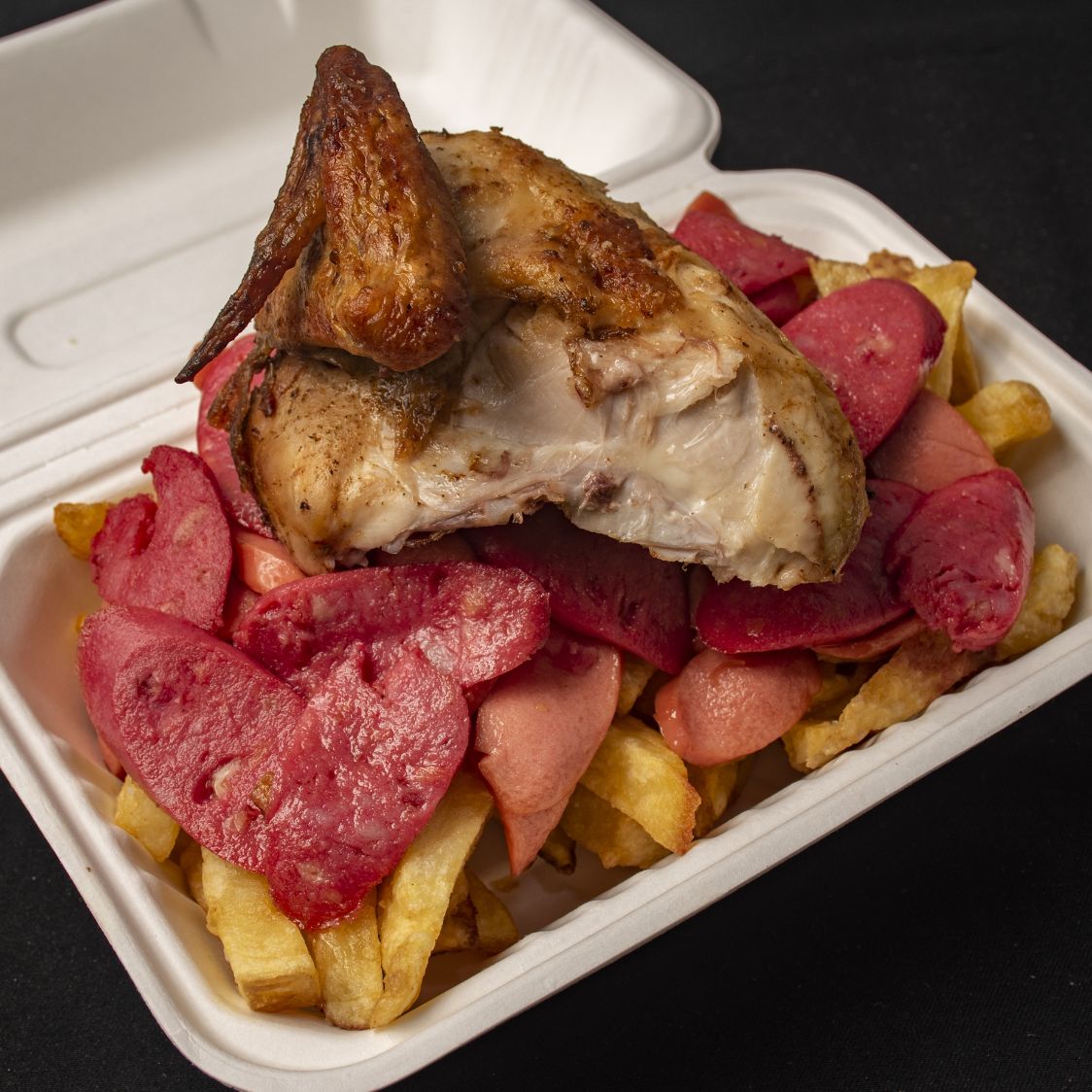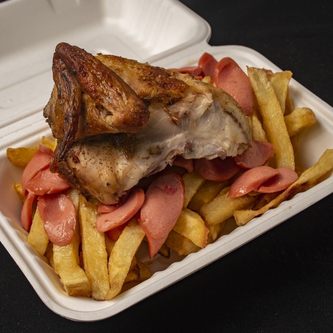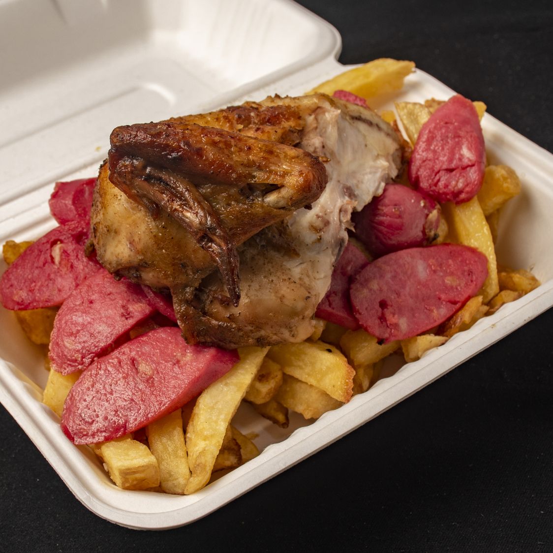 1/4 Pollo (presa según disponibilidad) + Chorizo en trozos + Papás Fritas (porción personal) + Cremas (mayonesa, ají y kétchup, cremas aparte).