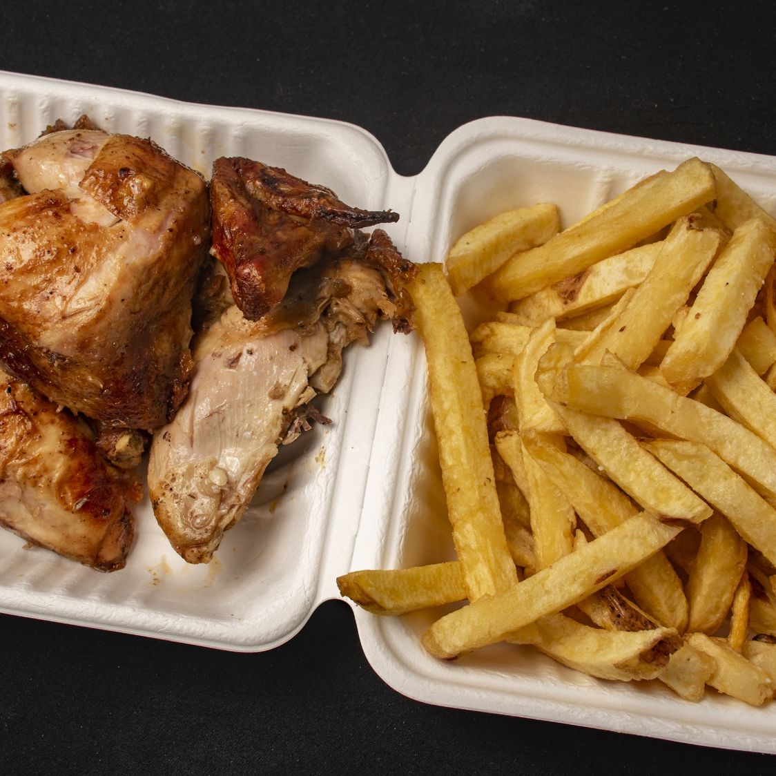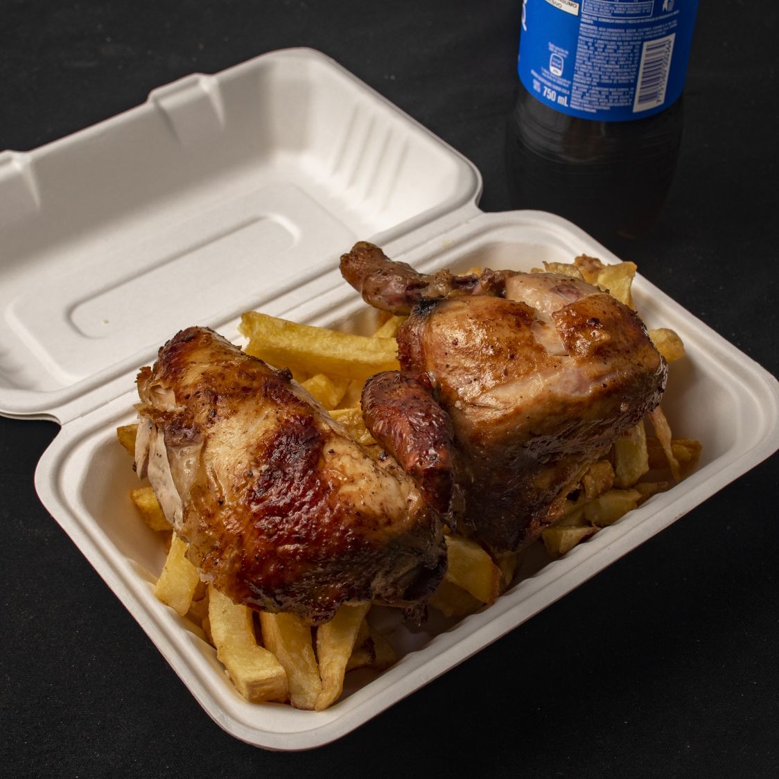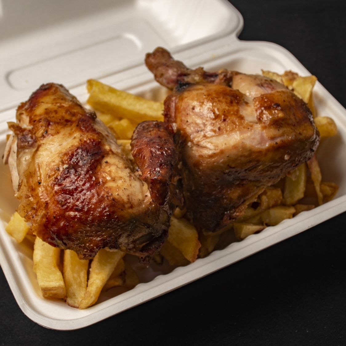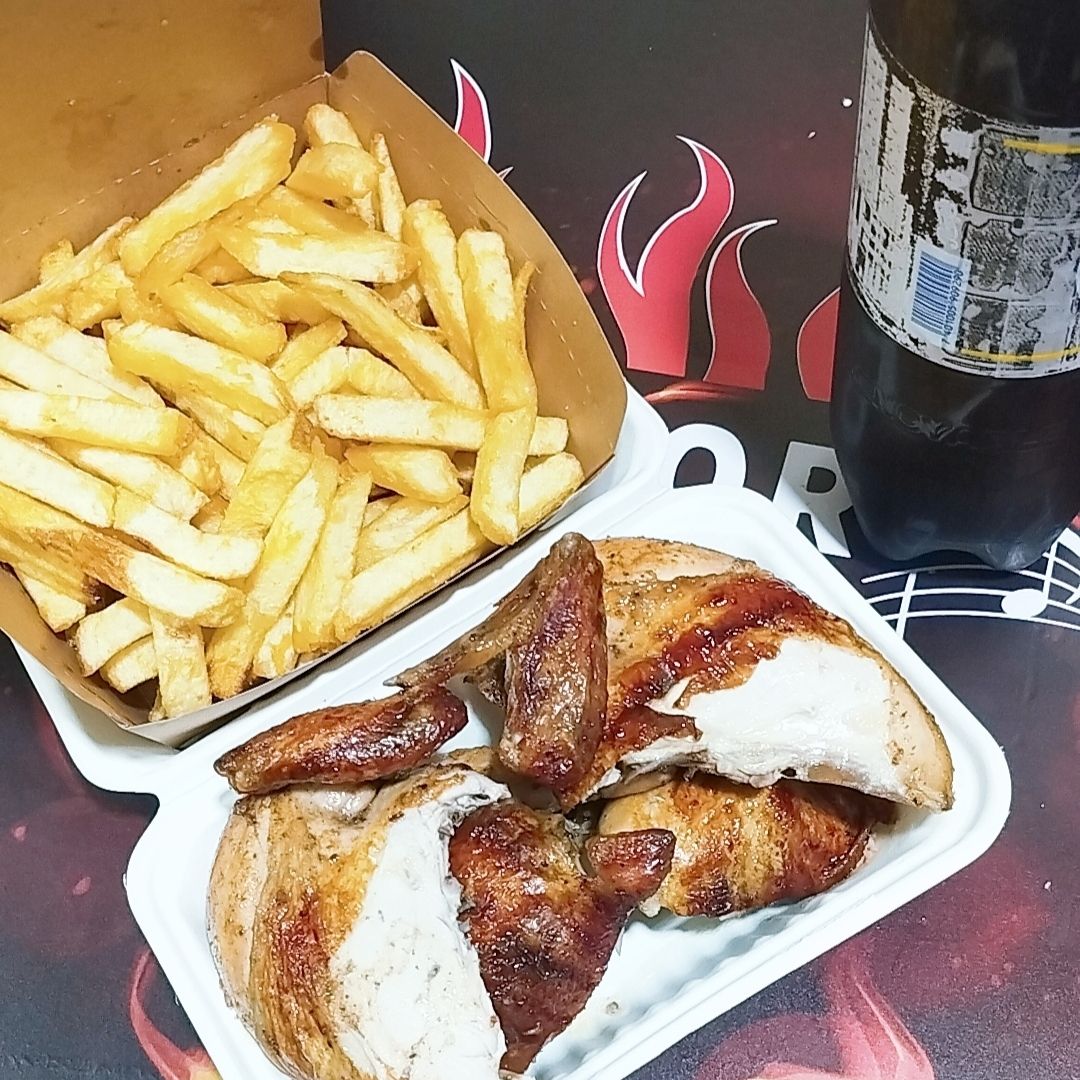 1/4 Pollo (presa según disponibilidad) + Chorizo en trozos + Papás Fritas (porción personal) + Cremas (mayonesa, ají y kétchup, cremas aparte).