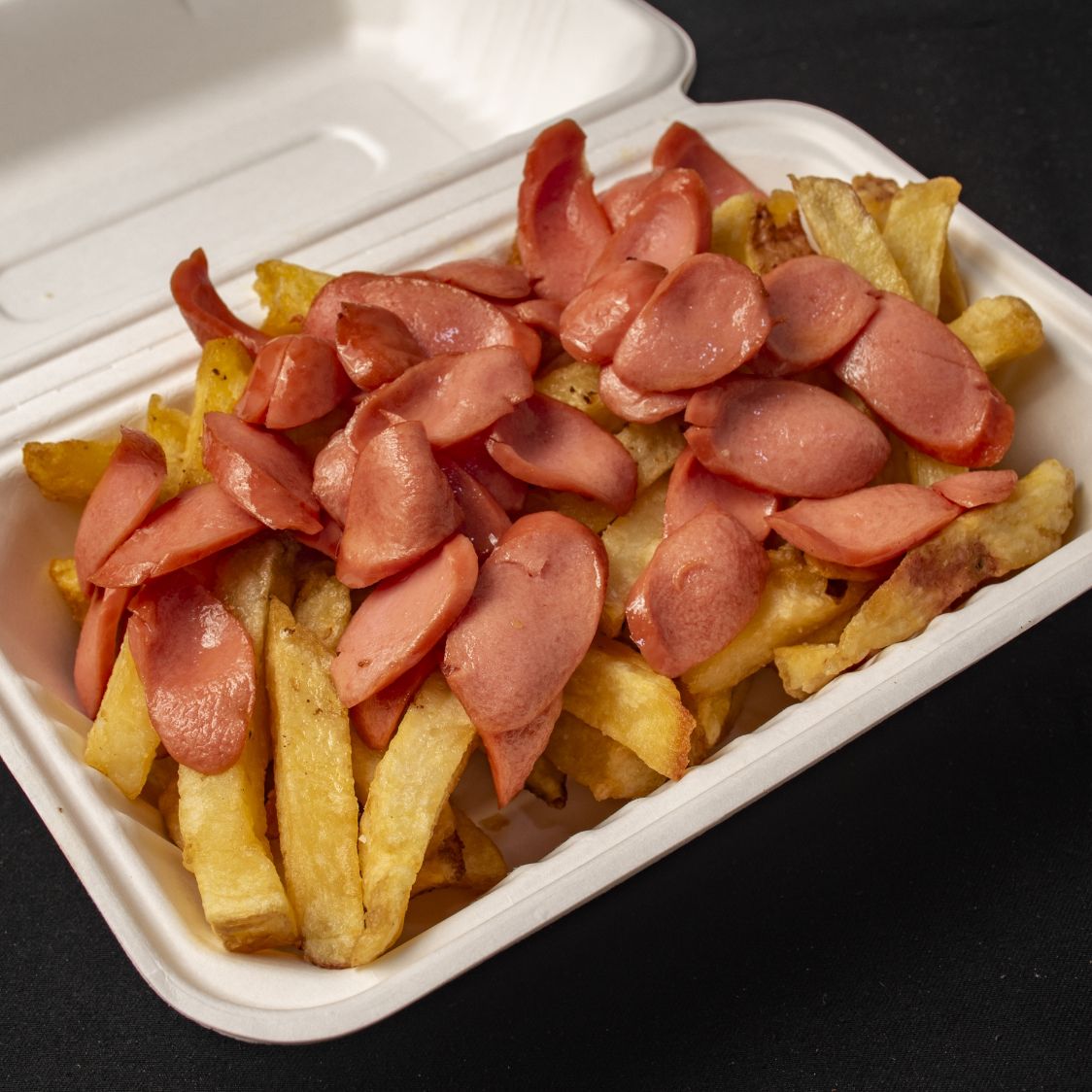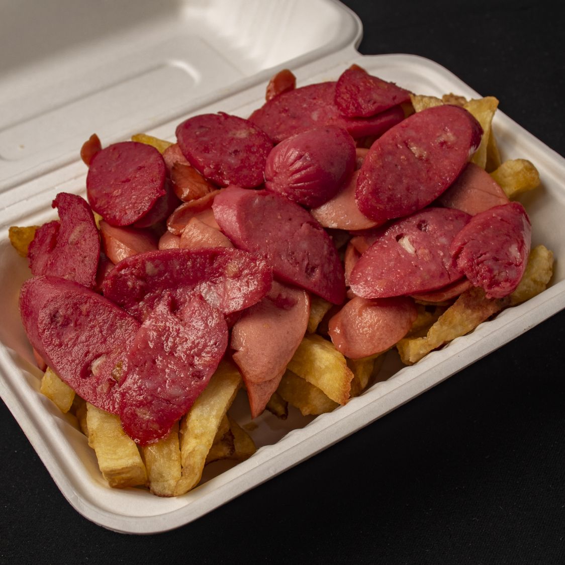 Hot Dog en trozos + Chorizo en trozos + Papás Fritas (porción personal) + Cremas (mayonesa, ají y kétchup, cremas aparte).