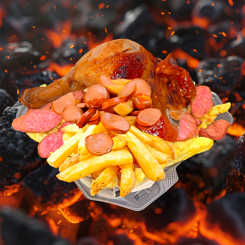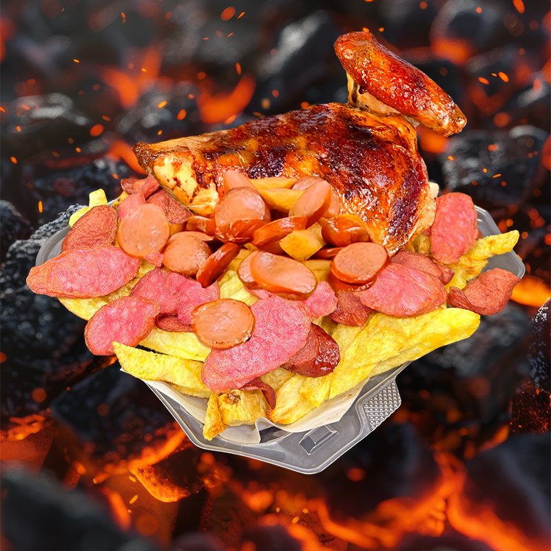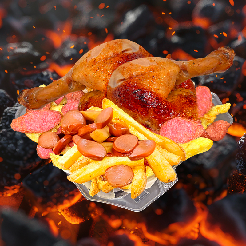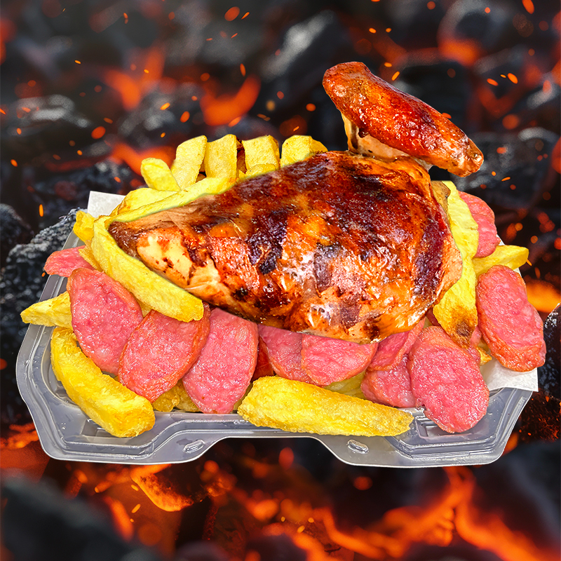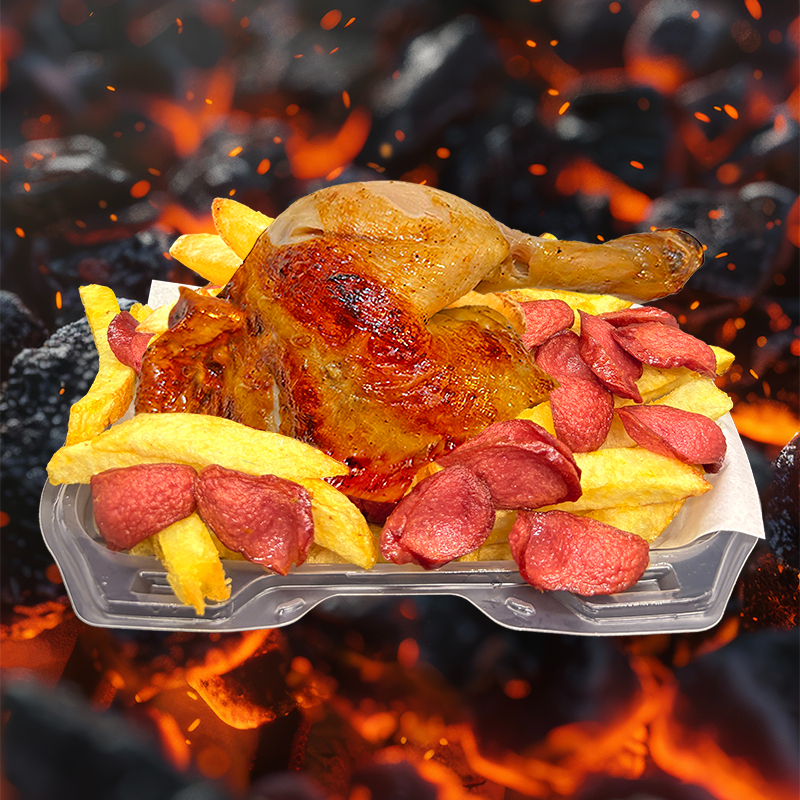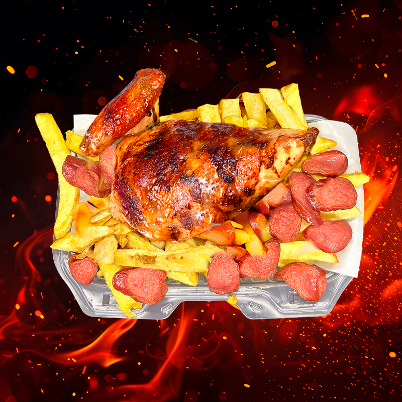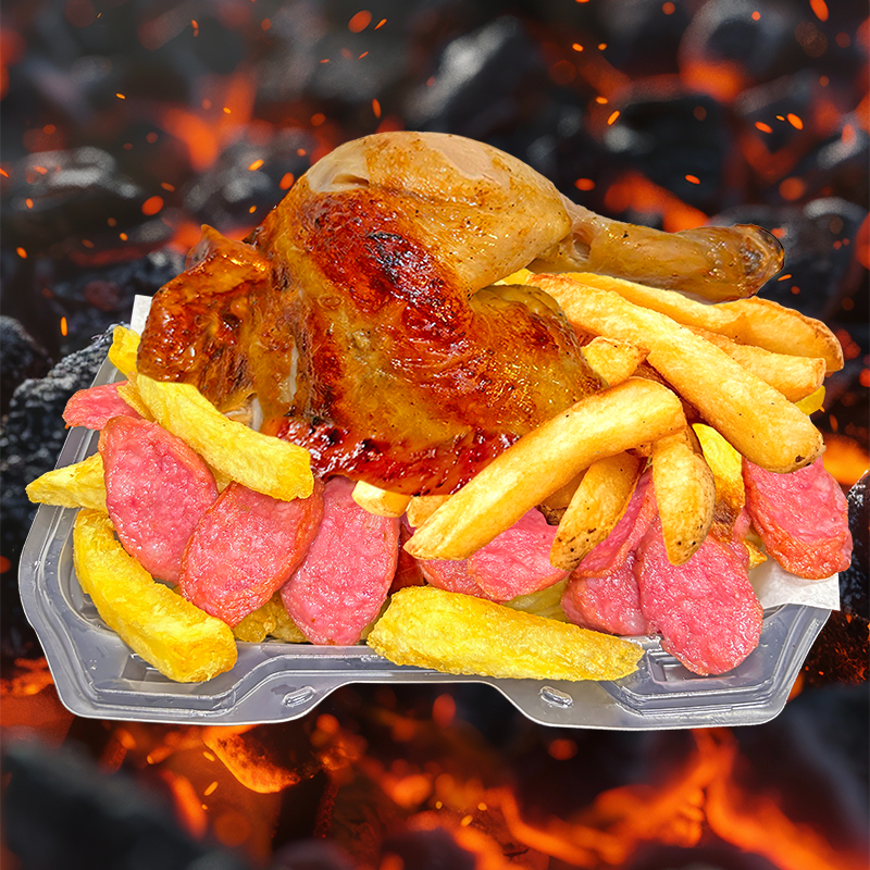 1/4 Pecho + Salchicha ahumada + Chorizo parrillero en trozos + Papas fritas + Cremas aparte (mayonesa, ají y kétchup).