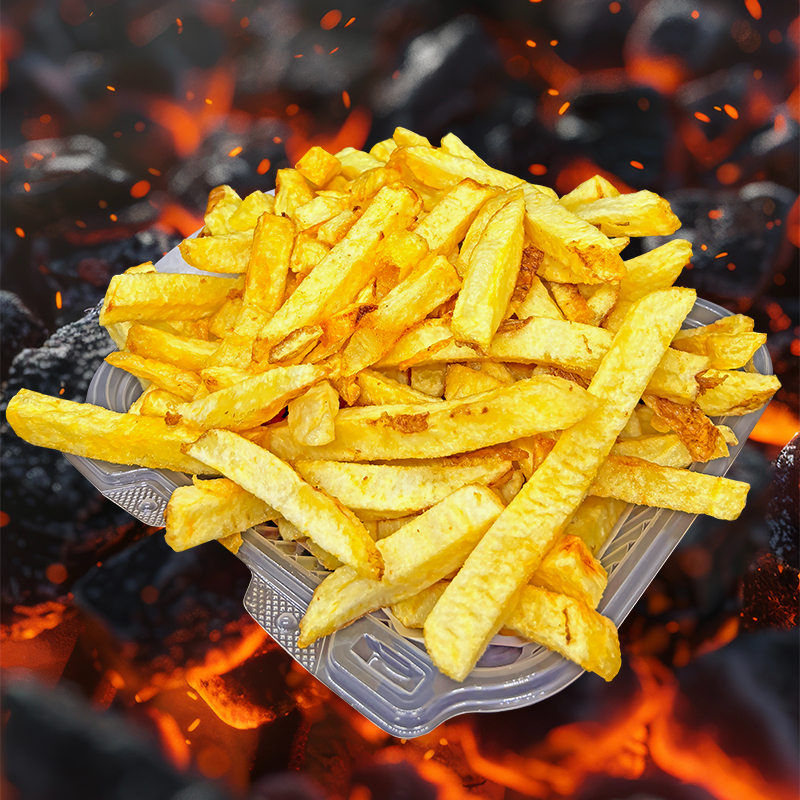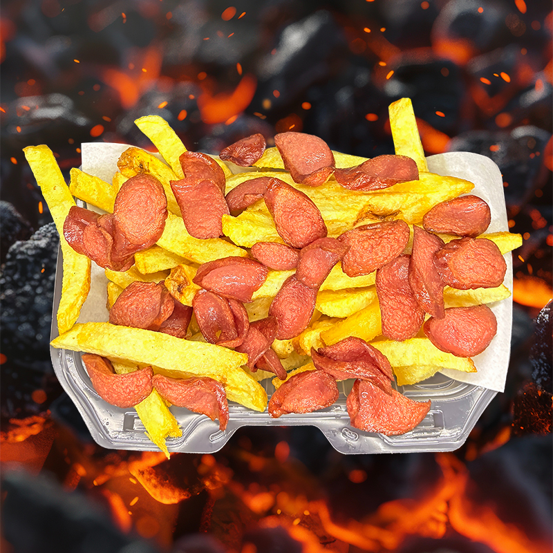 Chorizo parrillero en trozos + Papas Fritas + Cremas aparte (ají, mayonesa y kétchup).