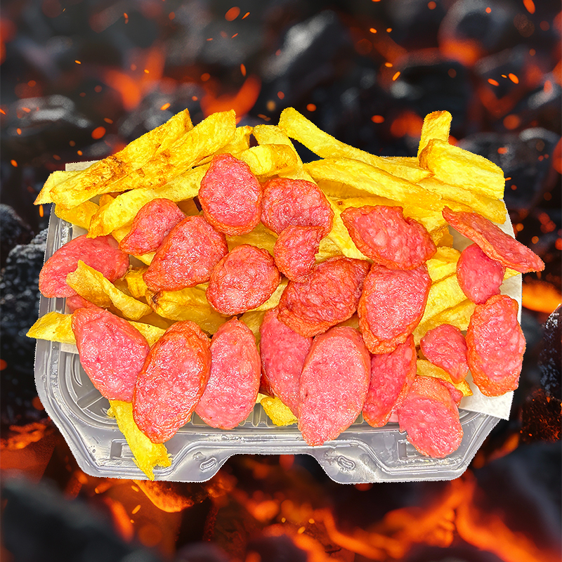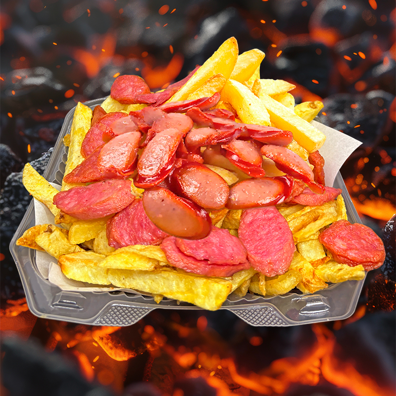 Salchicha ahumada + Chorizo parrillero en trozos + Papás Fritas + Cremas aparte (mayonesa, ají y kétchup).