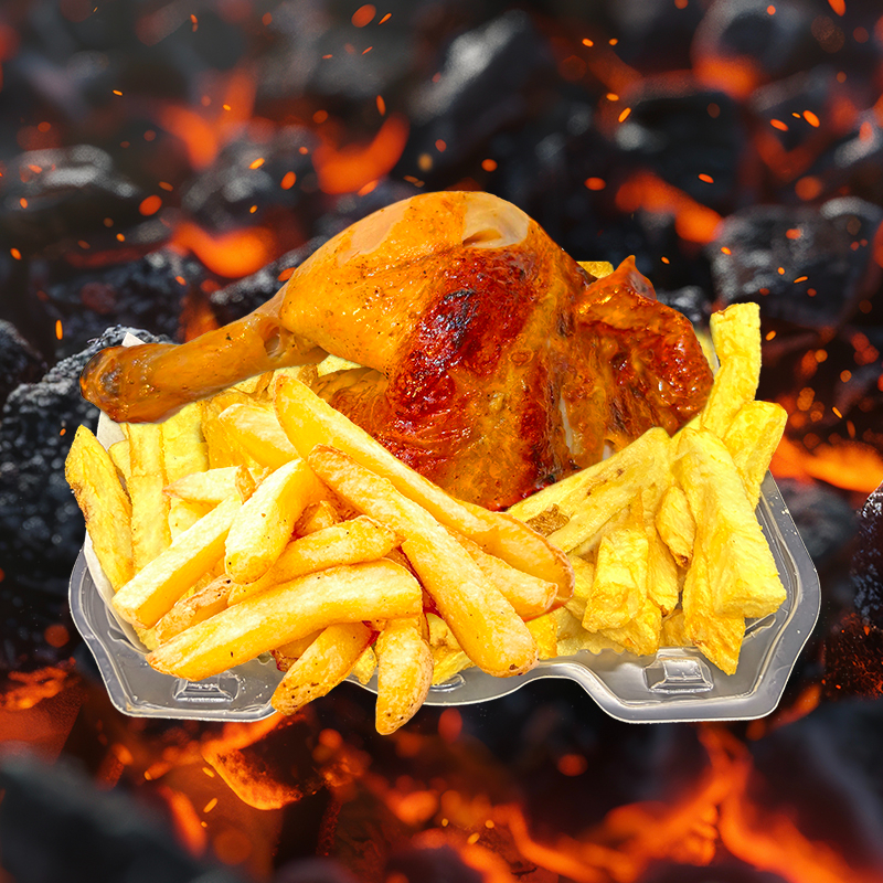 1/4 Pierna + Salchicha ahumada + Chorizo parrillero en trozos + Papas fritas + Cremas aparte (mayonesa, ají y kétchup).