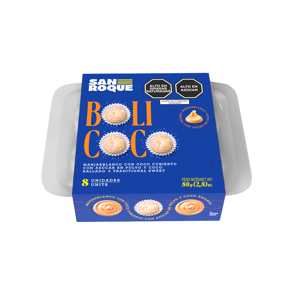 8 Unidades de bolitas de manjar San Roque, coco rallado y azúcar en polvo.