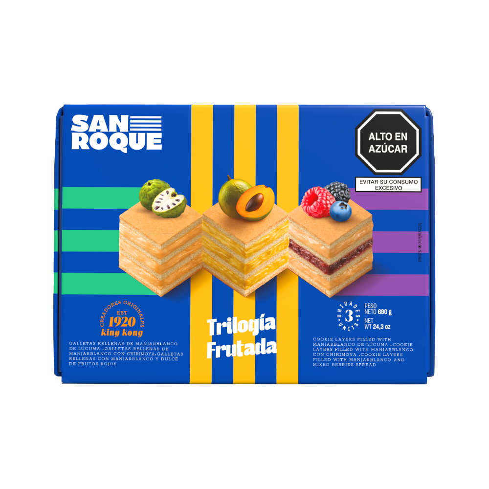 Una variedad de nuestros deliciosos productos San Roque: 1 unidad de king kong de manjar blanco y dulce de maracuyá 75 g, 1 unidad de king kong de manjar blanco de chirimoya 75 g, 1 unidad de king kong de manjar blanco 75 g, 2 unidades de antojo 30 g, 2 unidades de redonditos 46 g y 2 unidades de galletas paciencias sabor a naranja 40 g.