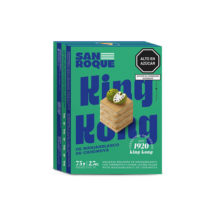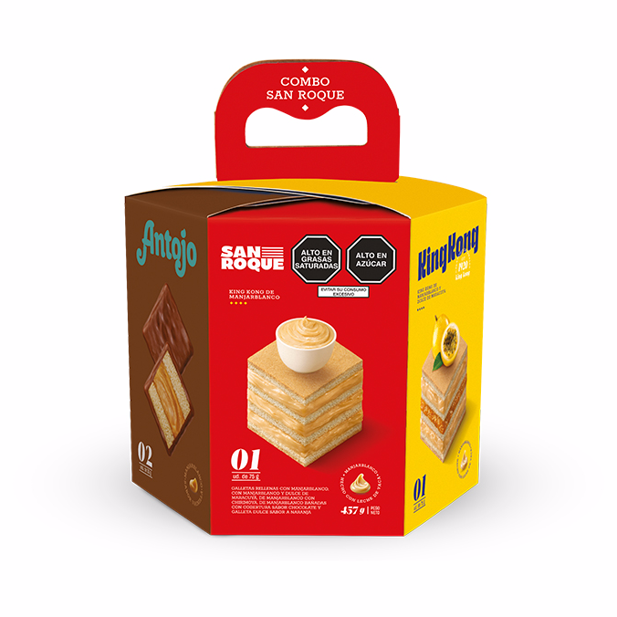 Una variedad de nuestros deliciosos productos San Roque: 1 unidad de king kong de manjar blanco y dulce de maracuyá 75 g, 1 unidad de king kong de manjar blanco de chirimoya 75 g, 1 unidad de king kong de manjar blanco 75 g, 2 unidades de antojo 30 g, 2 unidades de redonditos 46 g y 2 unidades de galletas paciencias sabor a naranja 40 g.