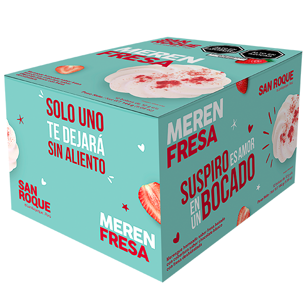 Merengue horneado sabor fresa bañado con cobertura sabor chocolate blanco con fresa deshidratada.