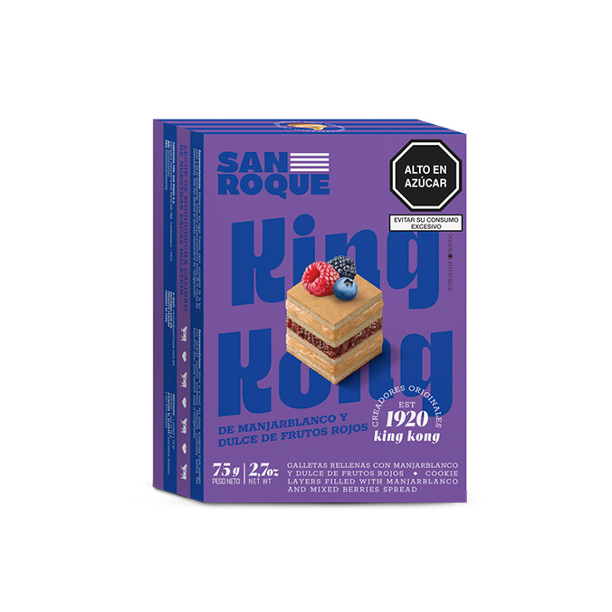 Porción de king kong de manjar blanco y frutos rojos cariño 75 g.