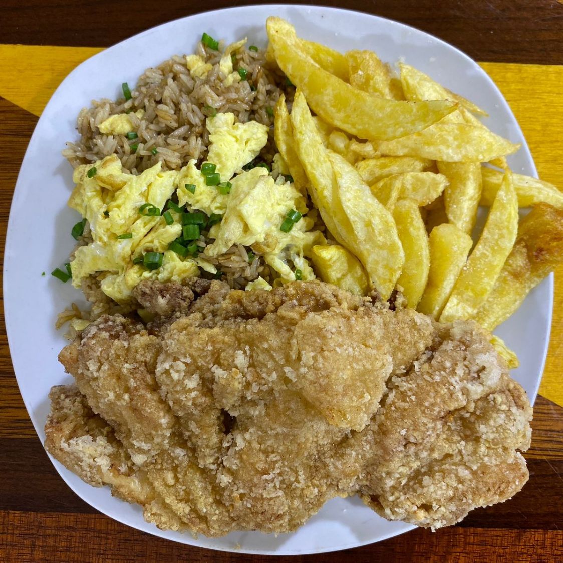 Filete de pollo,arroz, papas fritas, ensalada y cremas de la casa.
