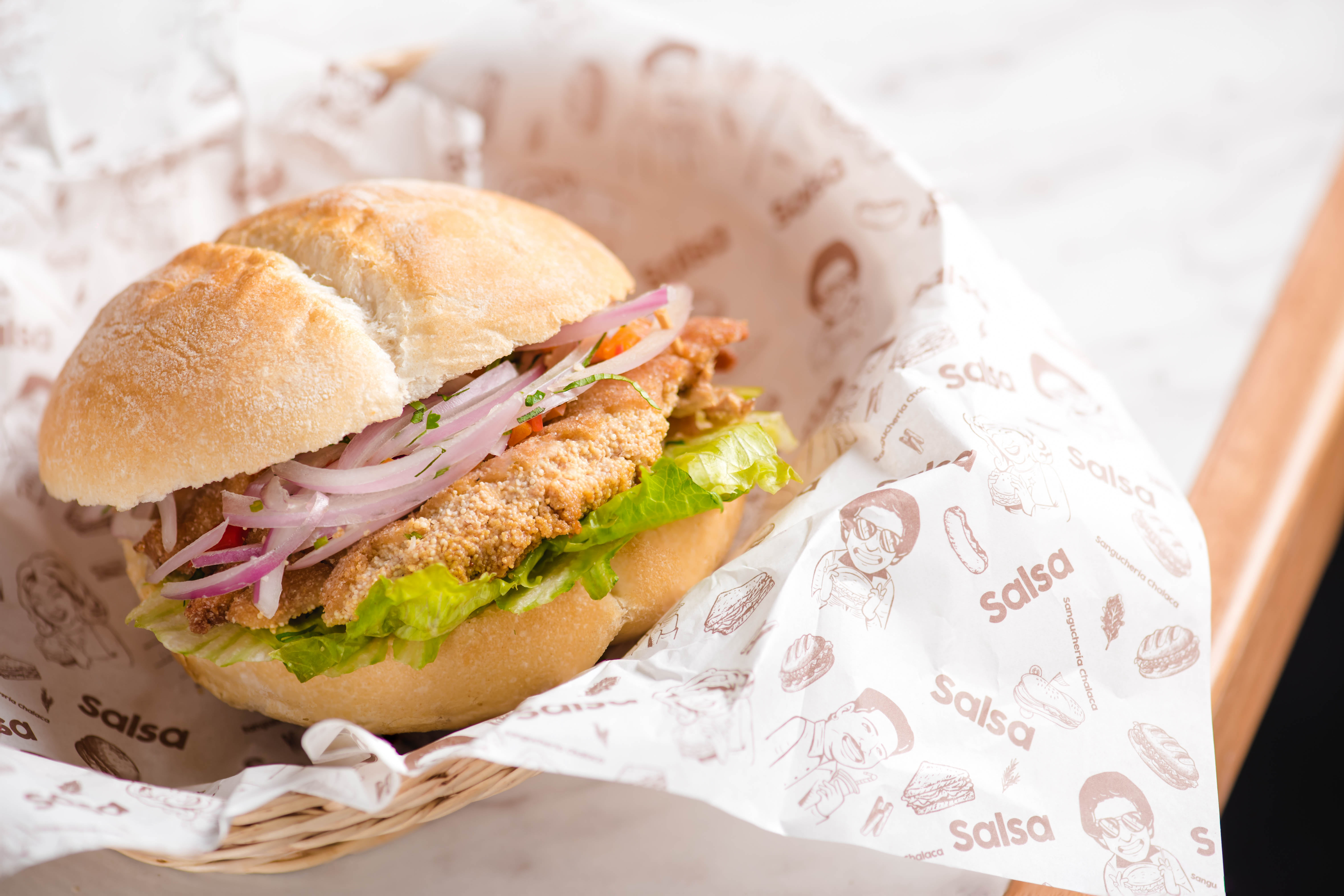 Pan con trozos de chicharrón y camote acompañado de salsa criolla a base de cebolla, limón y sal.