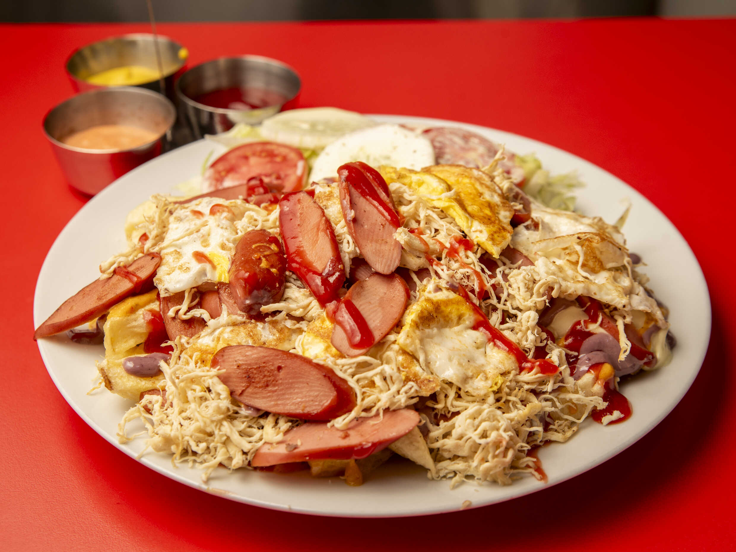 Pollo deshilachado, queso dambo, jamón, huevo frito, ensalada fresca de lechuga, tomate, pepinillos, papas al hilo o fritas y cremas a elección.