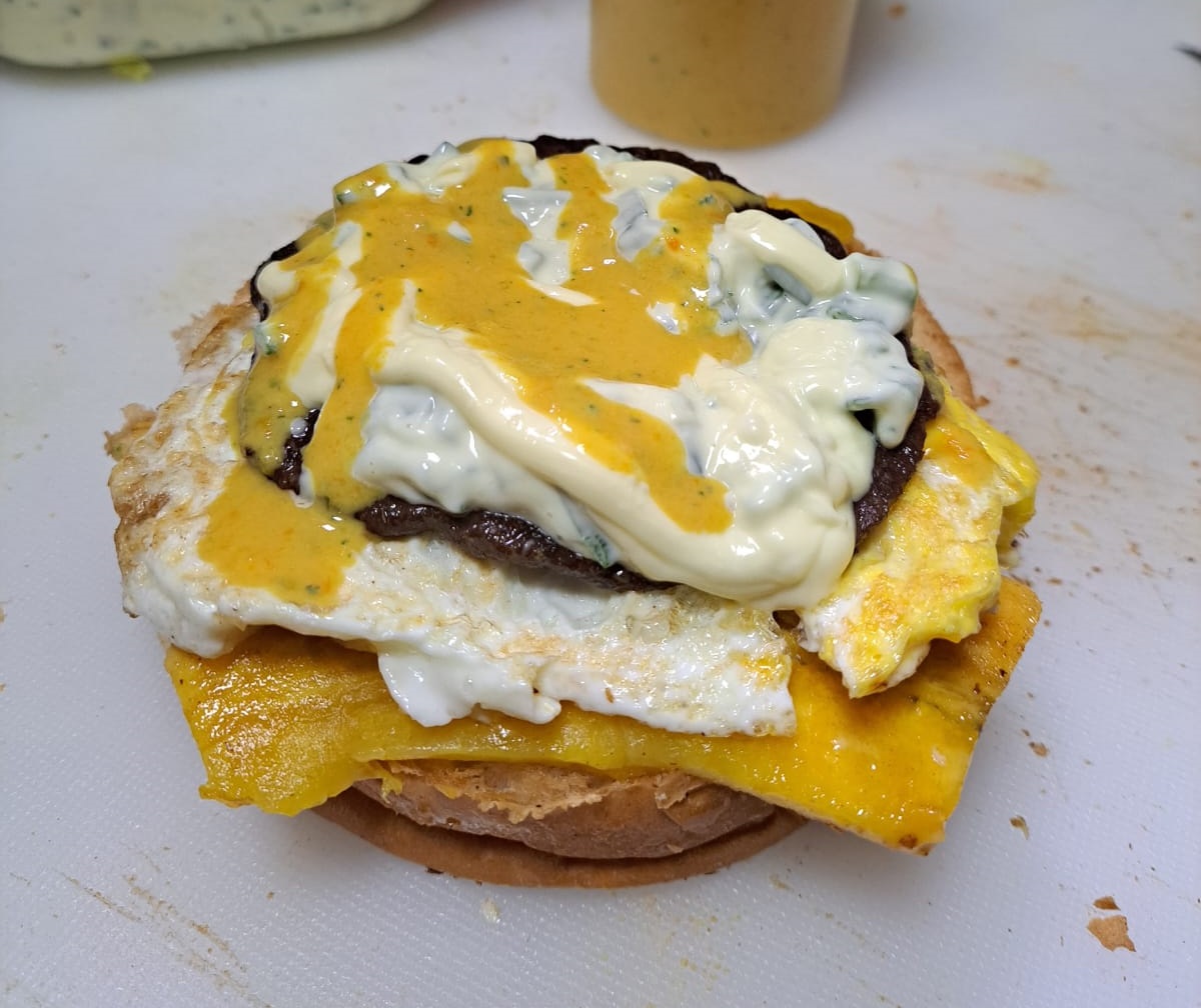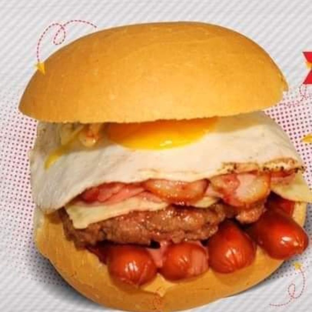 Hamburguesa casera .queso.jamon.tocino.hotdog.huevo.