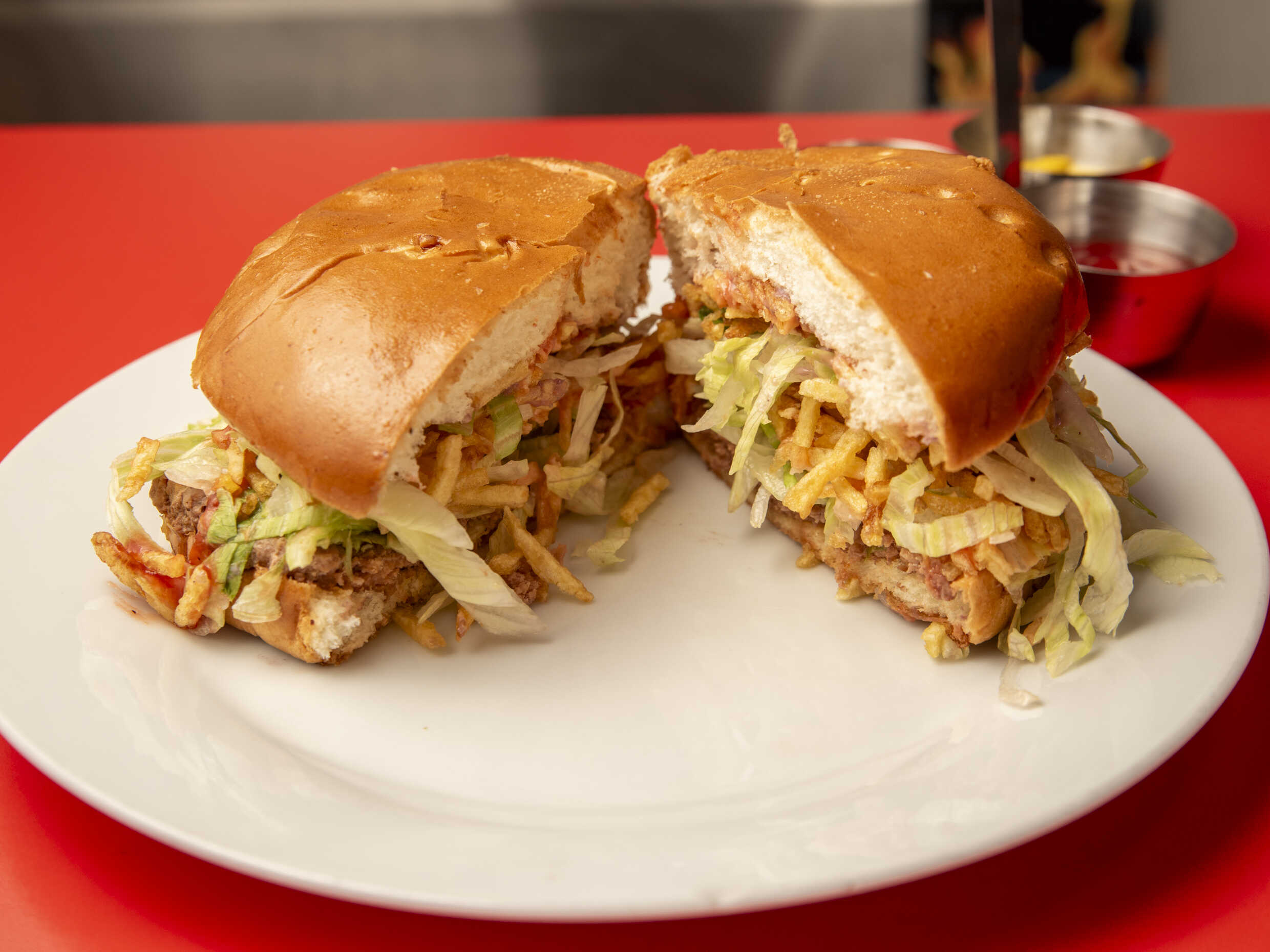 Hamburguesa 120 g, plátano frito, huevo frito, ensalada fresca lechuga, tomate, pepinillo, papas al hilo o fritas y cremas a elección.