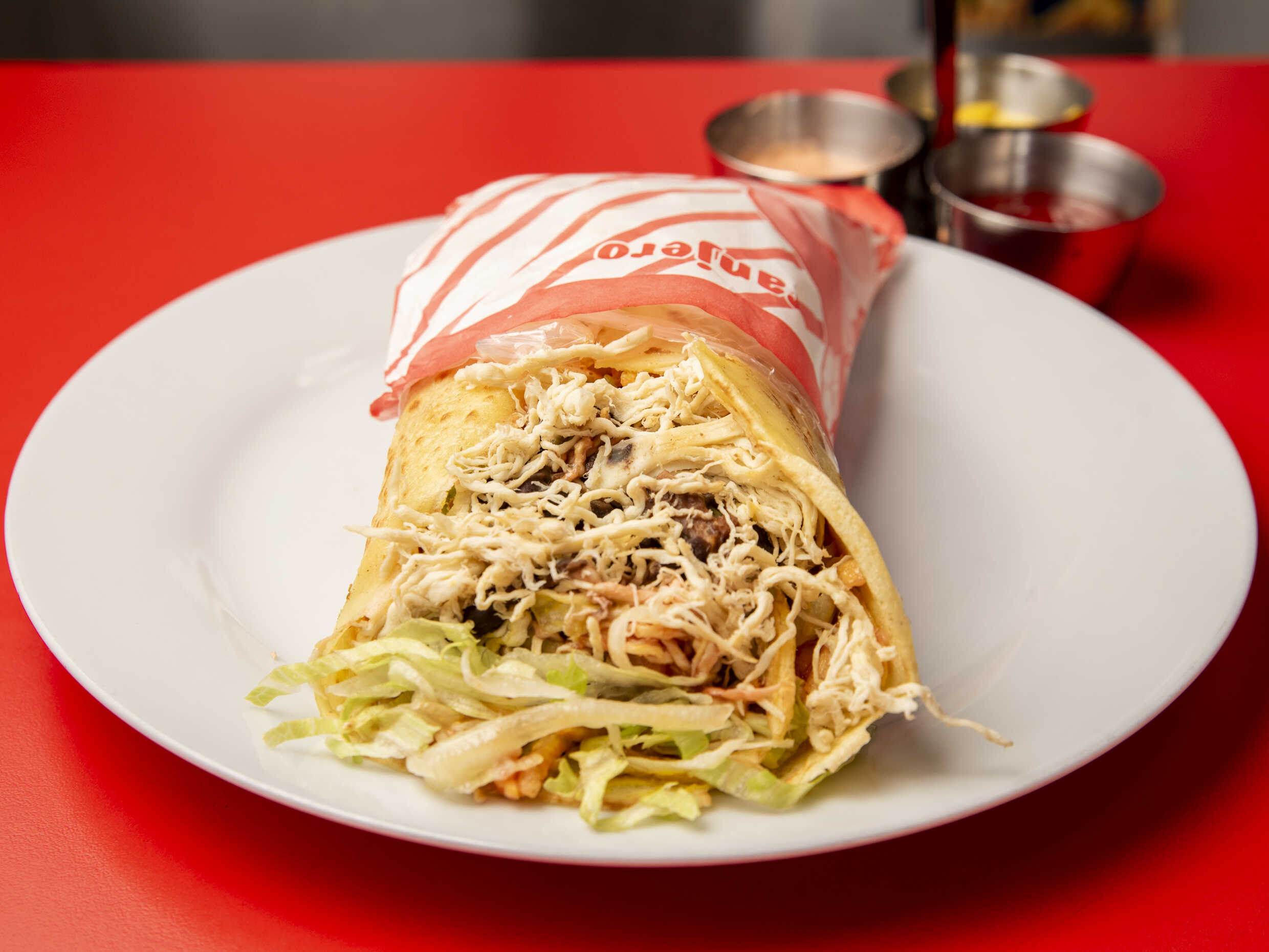 Tortilla de maíz, pollo deshilachado, papas al hilo, ensalada de lechuga, tomate y cremas a elección.