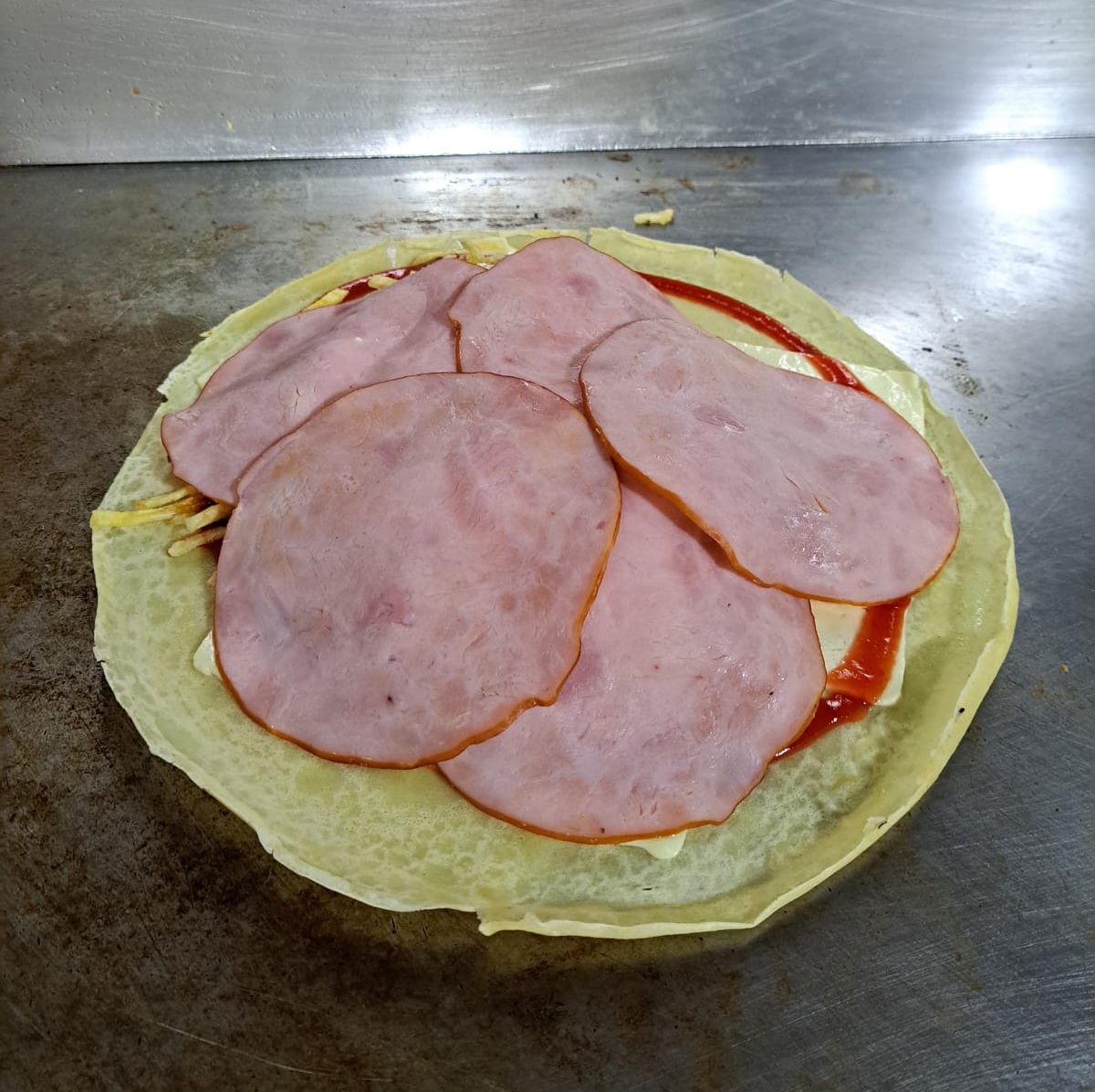 Tortilla de maiz, lomito ahumado. papas al hilo, ensalada lechuga y tomate. Cremas a elección
