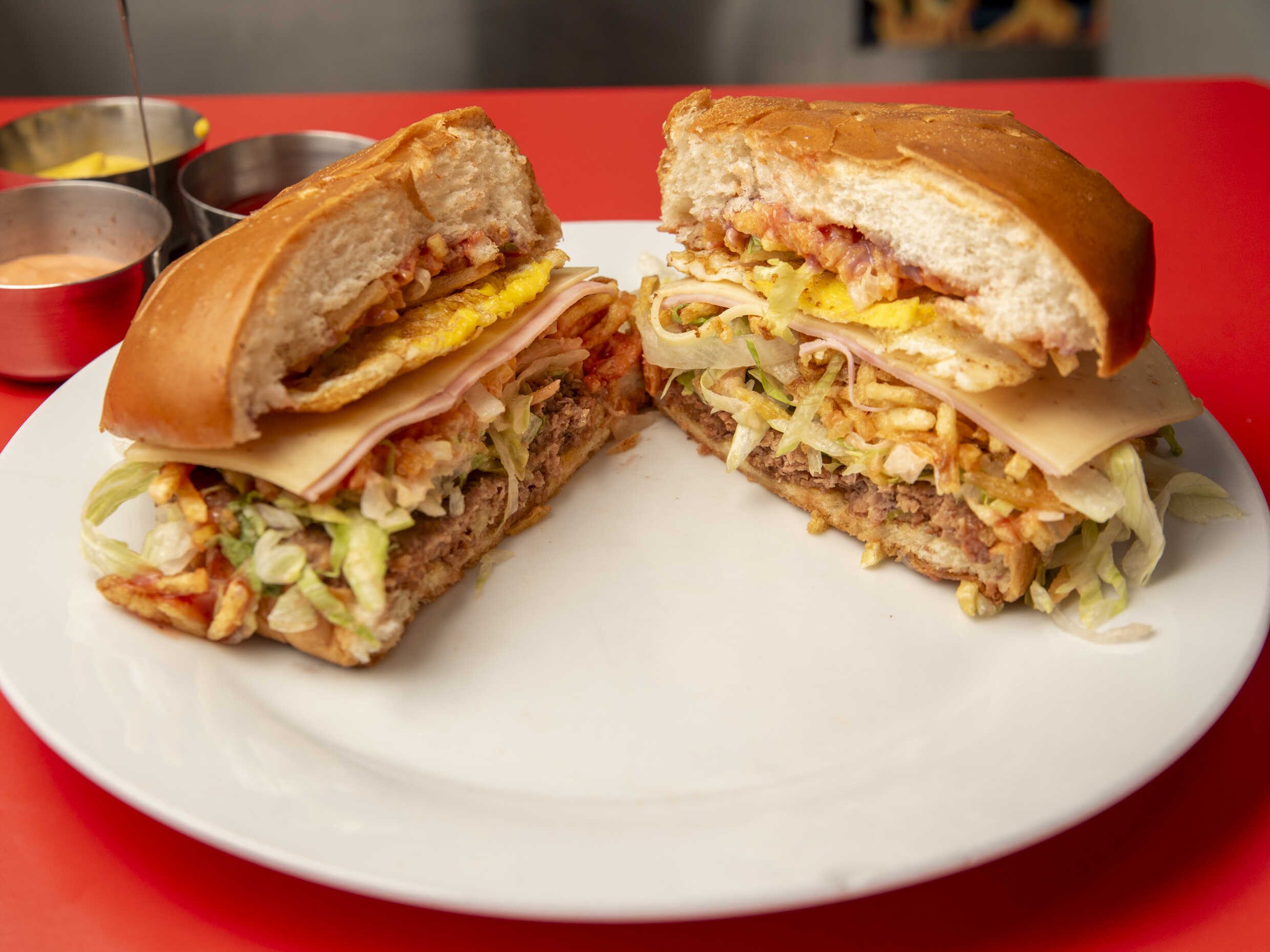 Hamburguesa 120 g, queso dambo, jamón, huevo frito, ensalada fresca lechuga, tomate, pepinillos, papas al hilo o fritas y cremas a elección.