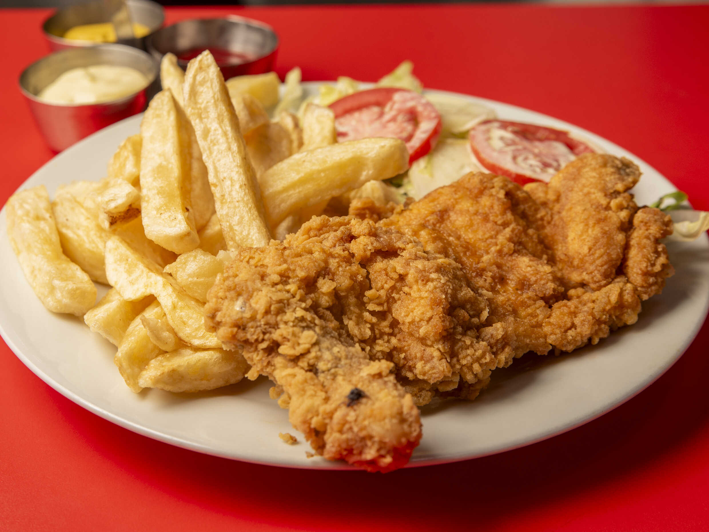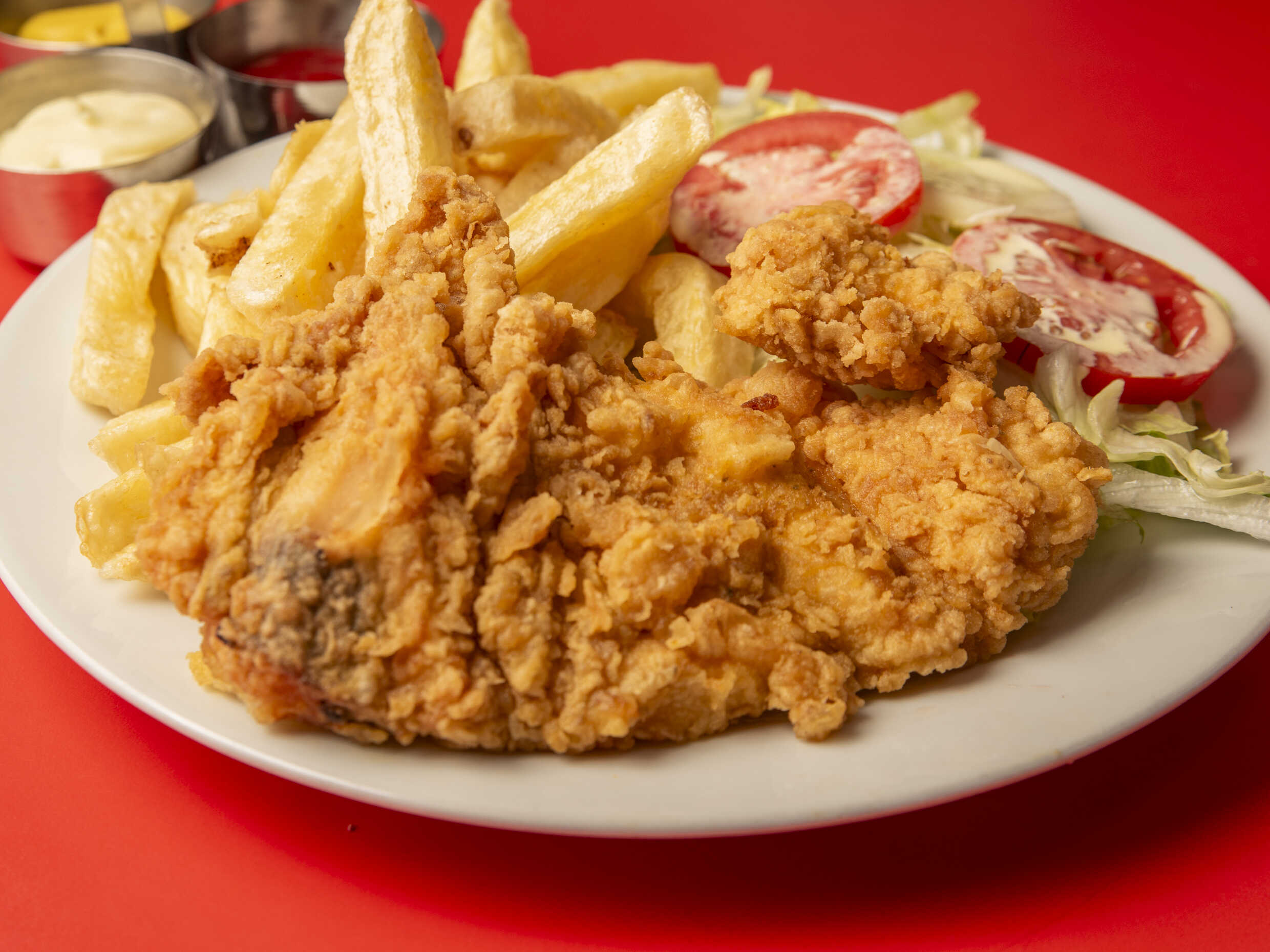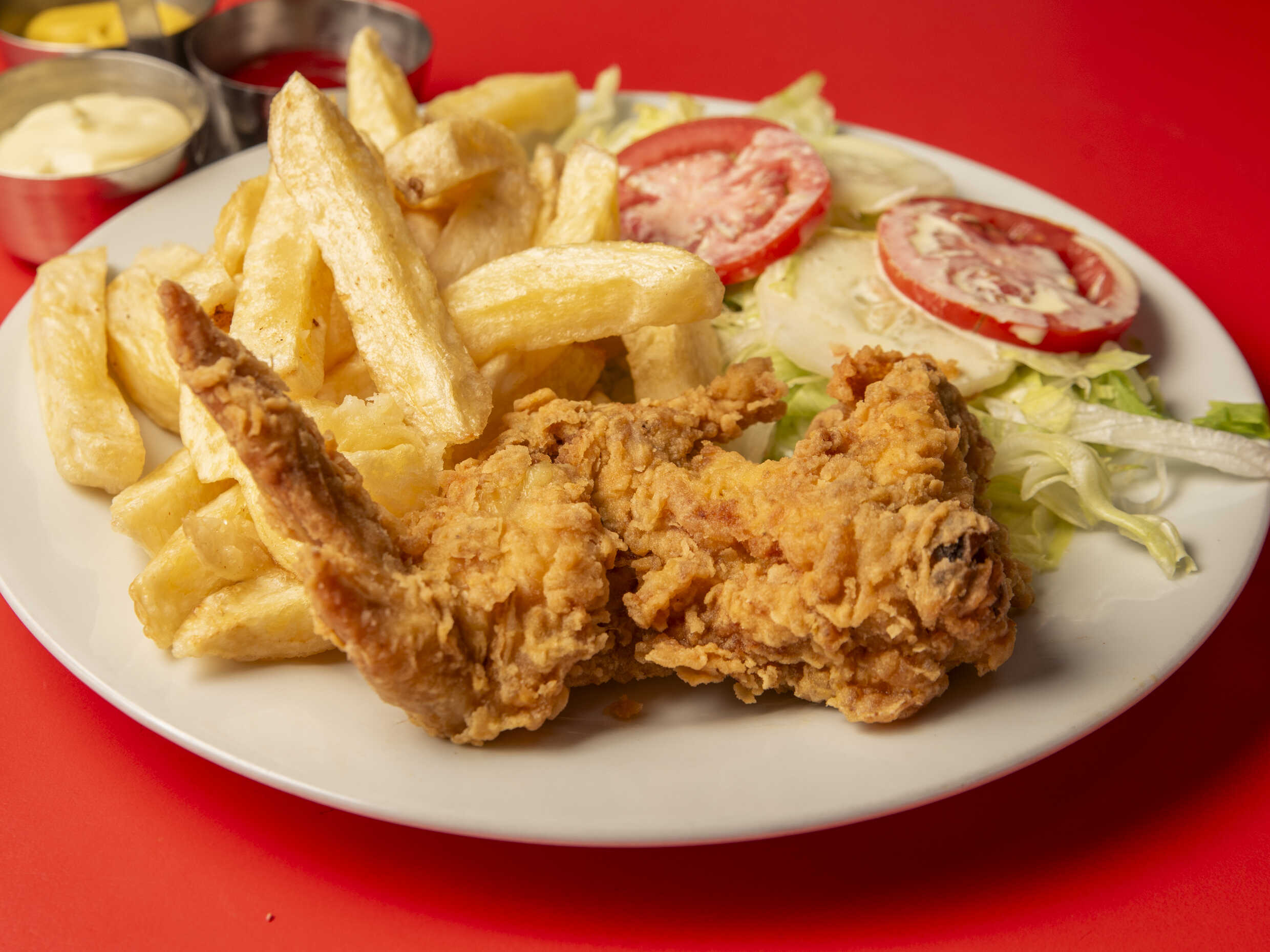 Suprema de pollo, ensalada fresca lechuga, tomate y pepinillo, papas al hilo o fritas y cremas a elección.