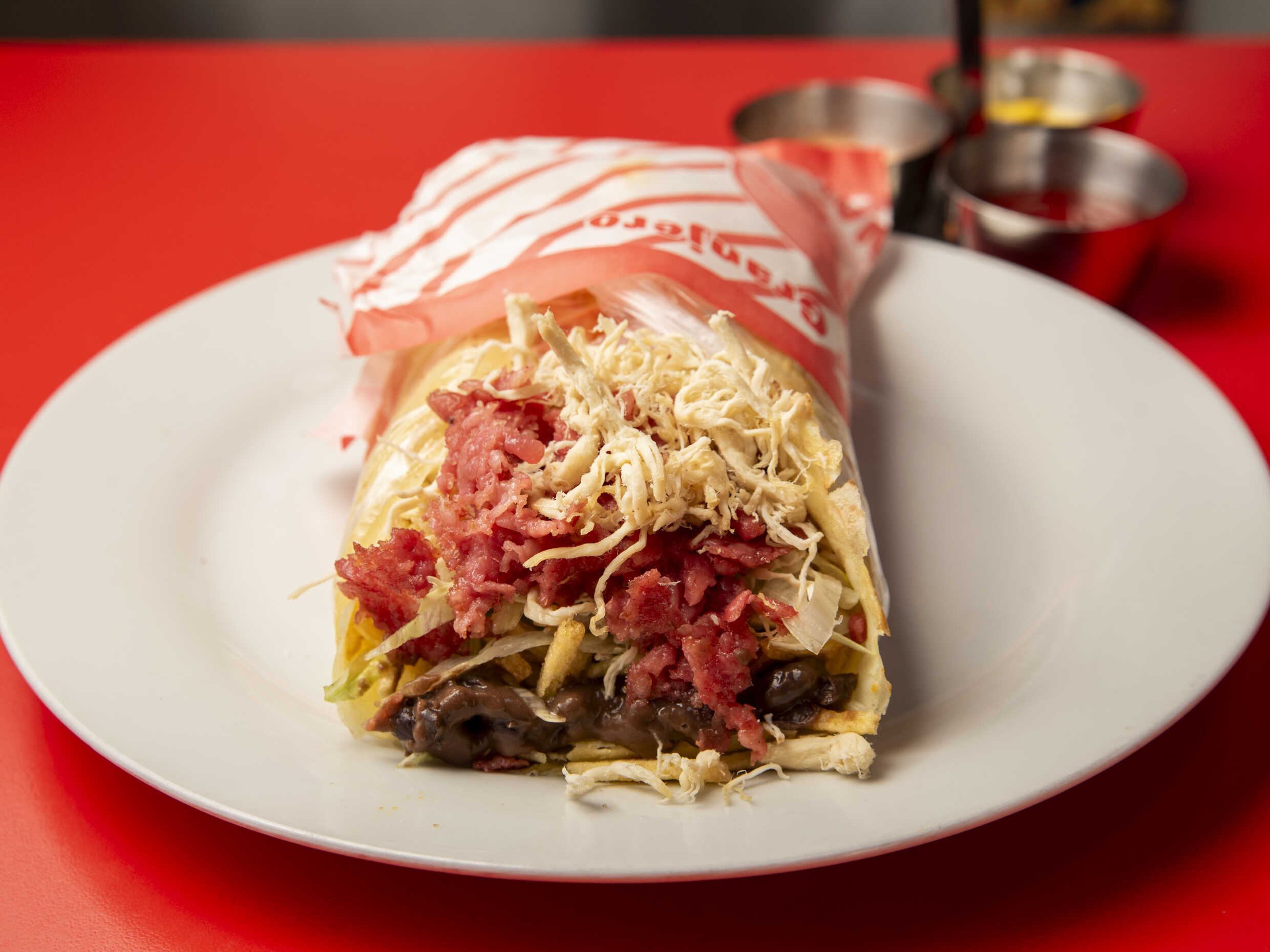 Tortilla de maíz, pollo, chorizo en trocitos, papas al hilo, ensalada de lechuga, tomate y cremas a elección.