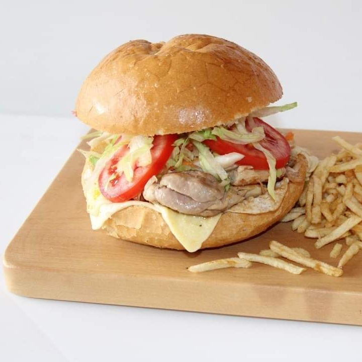 Acompañado de papas fritas, ensalada fresca, lechuga, tomate y cremas a elección.