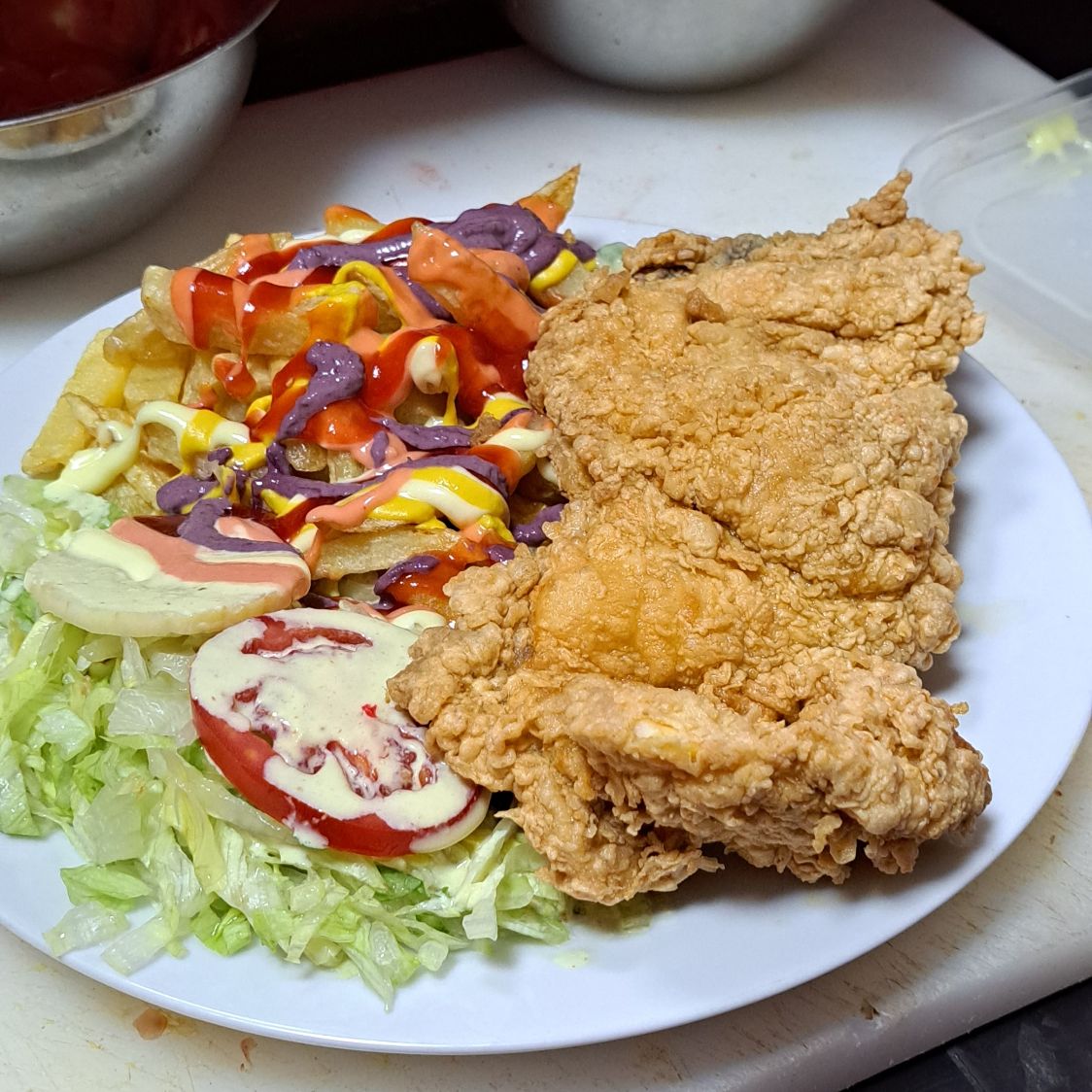 Milanesa de pollo, queso dambo, jamón, huevo frito, ensalada fresca de lechuga, tomate, pepinillos, papas al hilo o fritas y cremas a elección.
