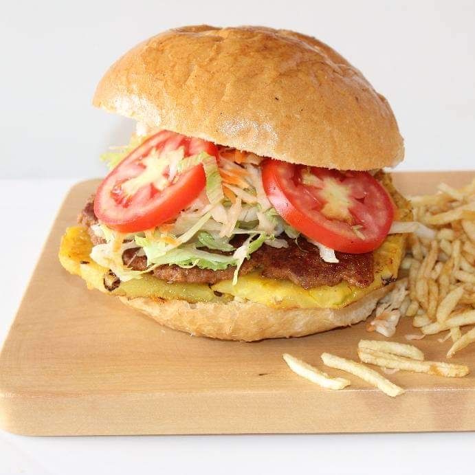 Hamburguesa 120 g, queso dambo, piña, ensalada fresca de lechuga, tomate, pepinillos, papas al hilo o fritas y cremas a elección.
