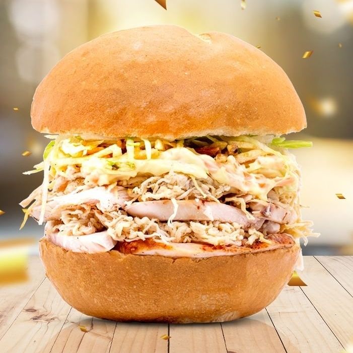 Suprema de pollo, queso dambo, piña, ensalada fresca de lechuga, tomate, pepinillos, papas al hilo o fritas y cremas a elección.