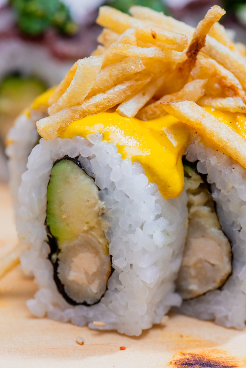 6 cortes: Relleno de tofu furai y palta, bañada en salsa acevichada e hilos de camote frito.