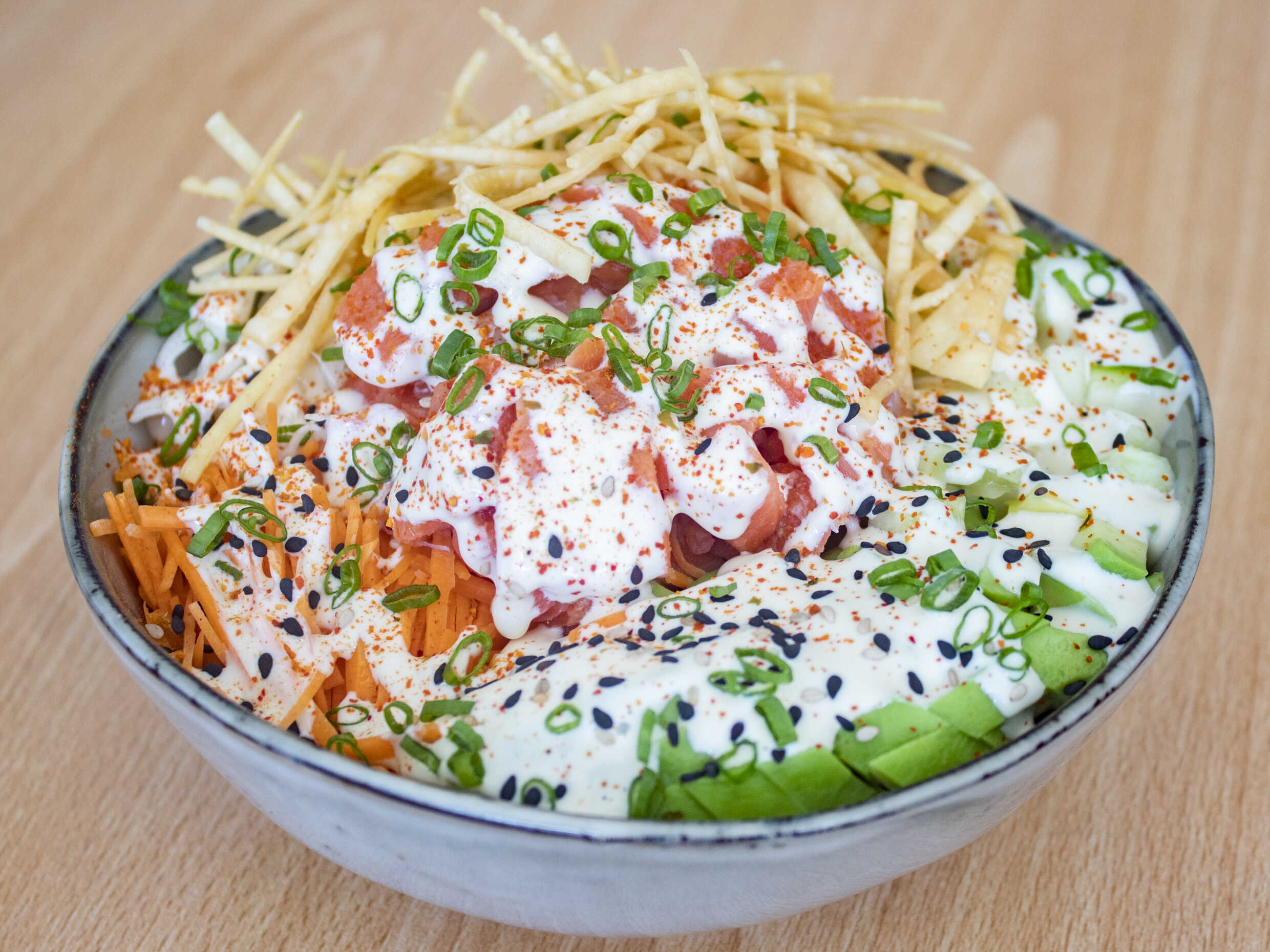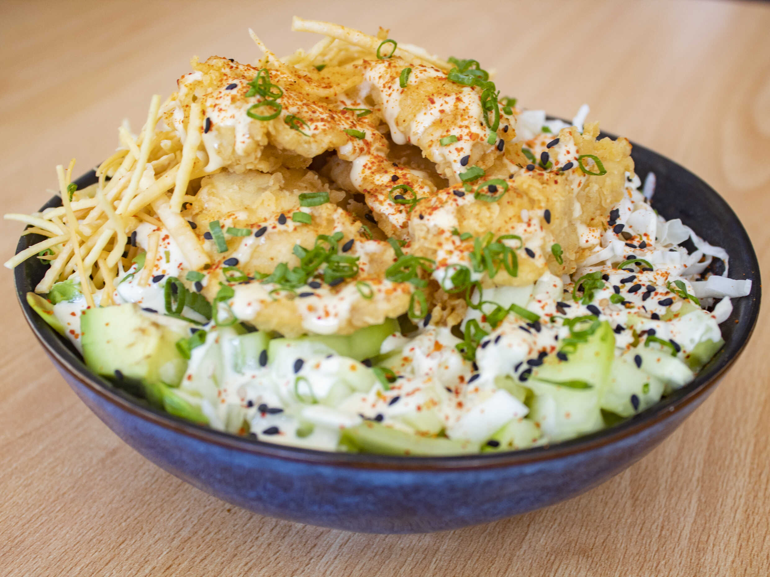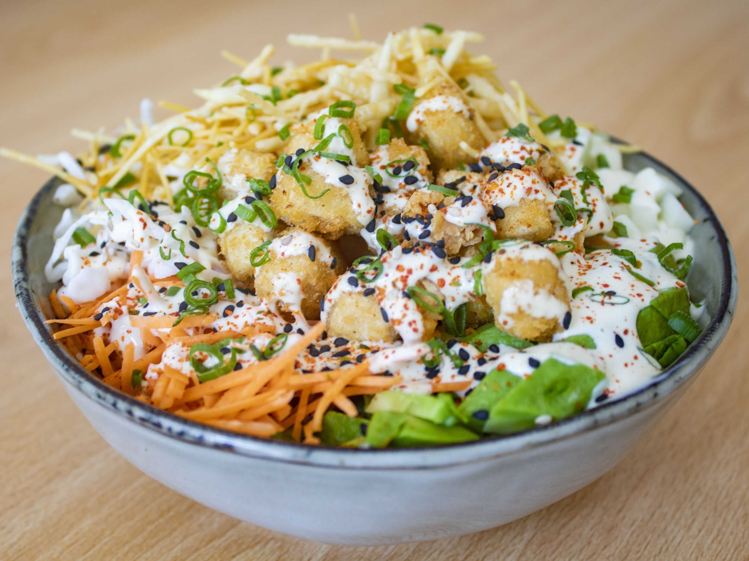 2 Poke Chicken Crispy a base de arroz sushi, chicken crispy, zanahoria, col, palta y crunchy de wantan.