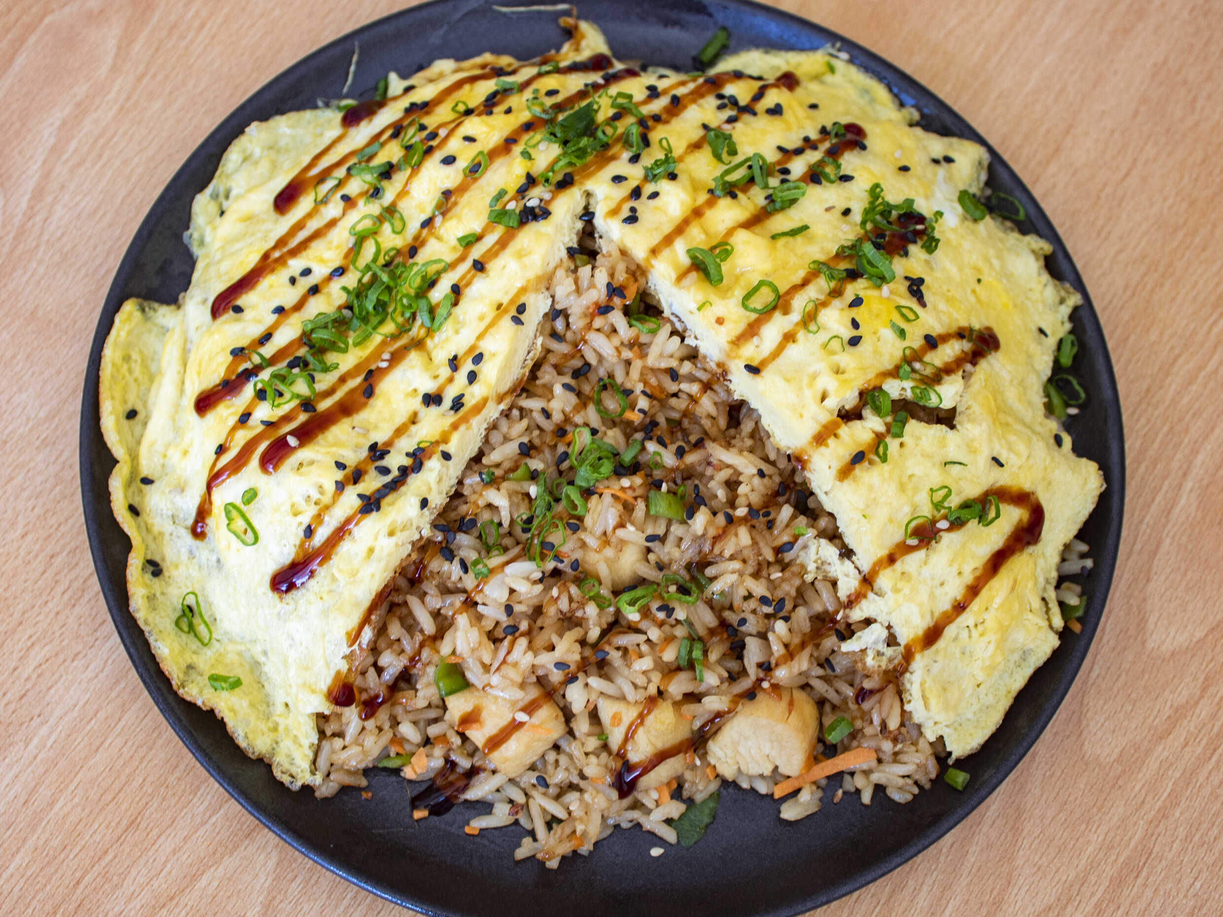 Platillo a base de arroz frito al wok, pollo, huevo y vegetales estilo japonés