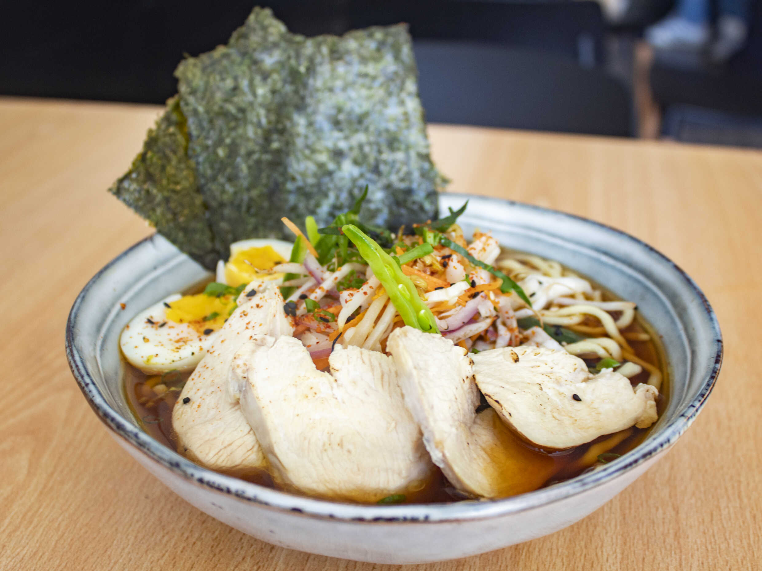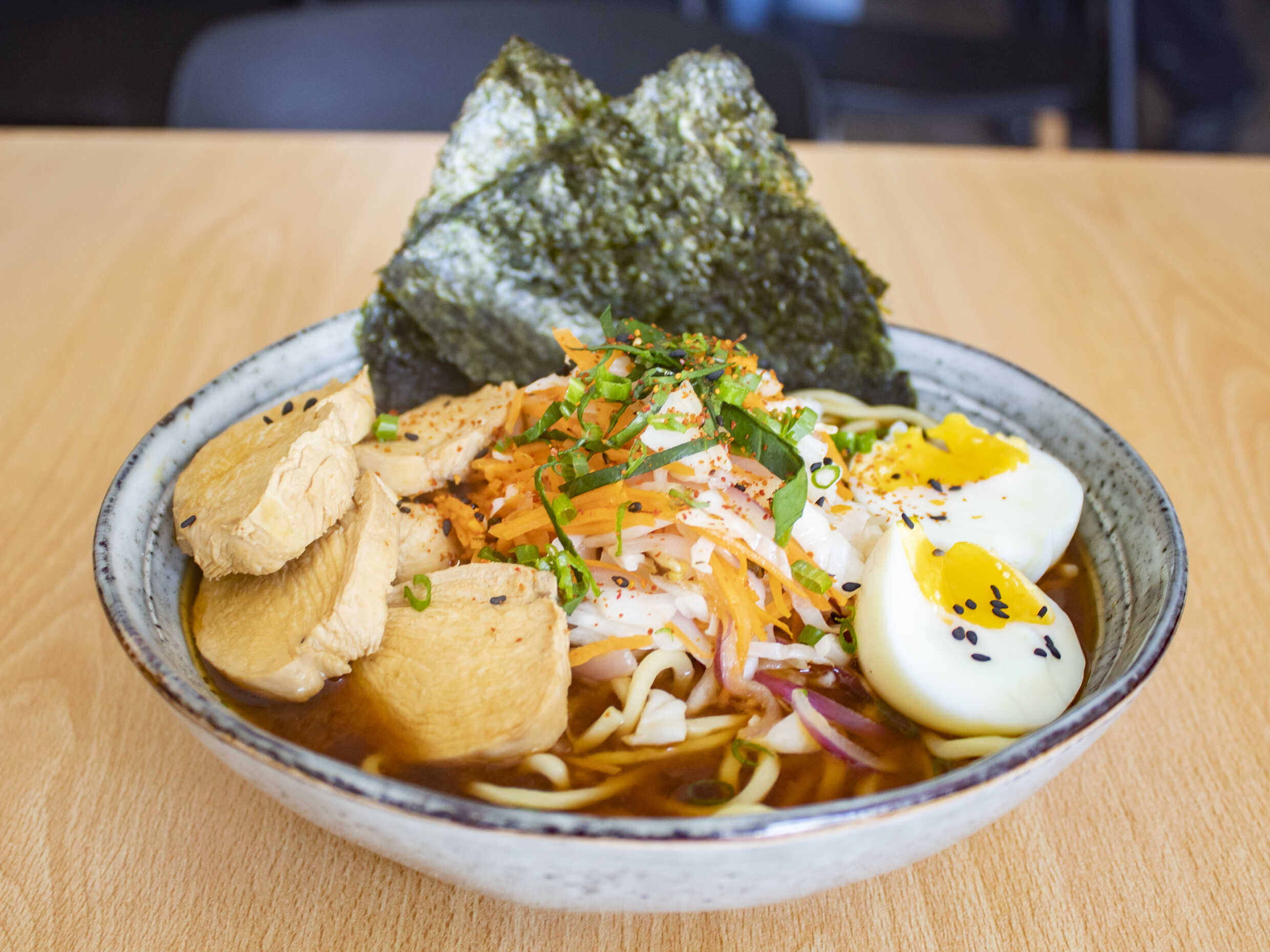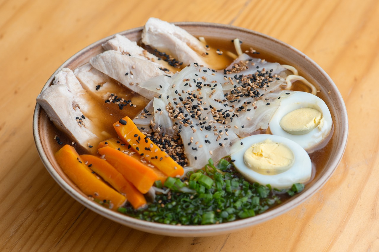 fideos ramen, concentrado de miso y caldo picante, huevo proteina a elección