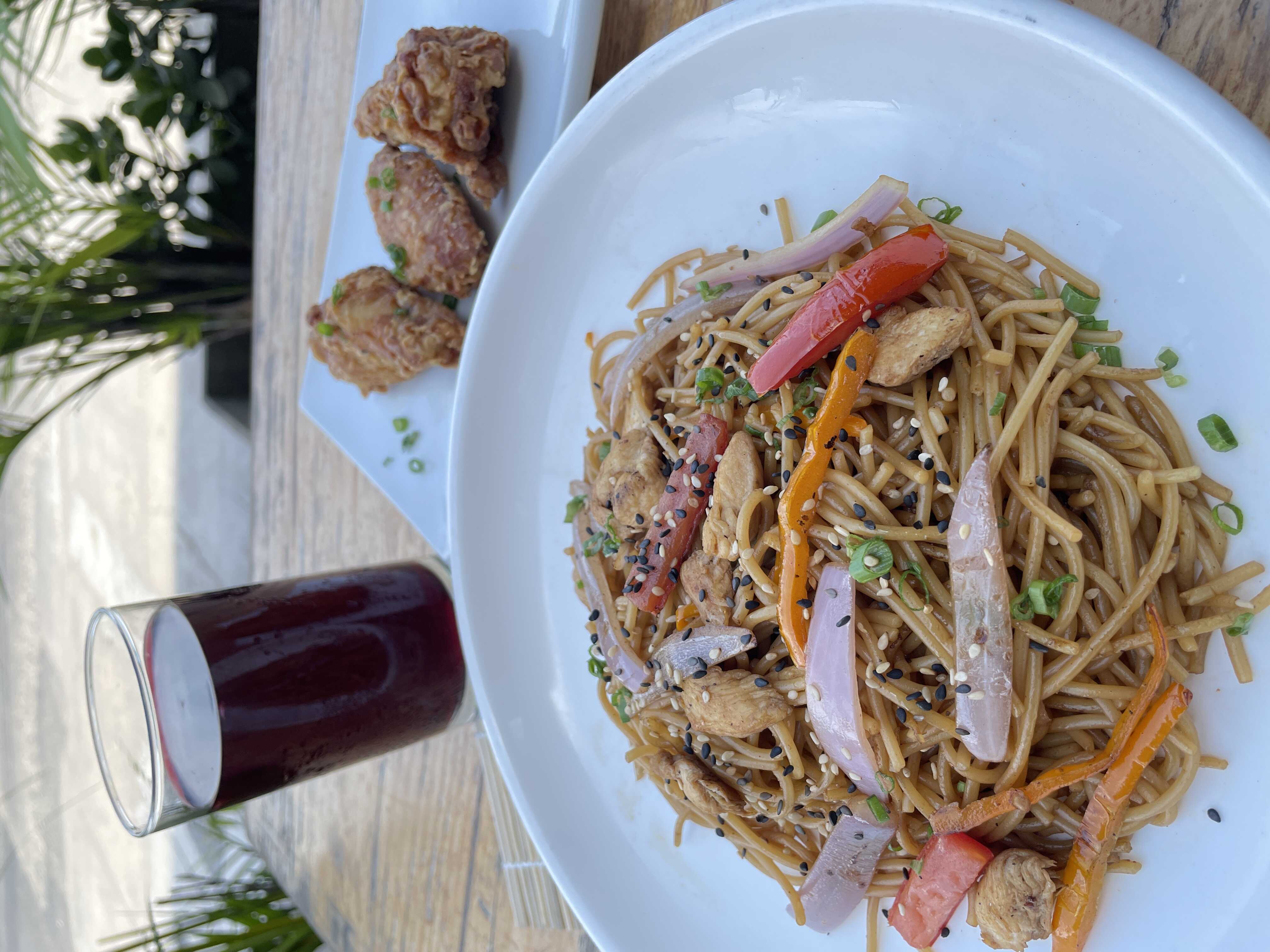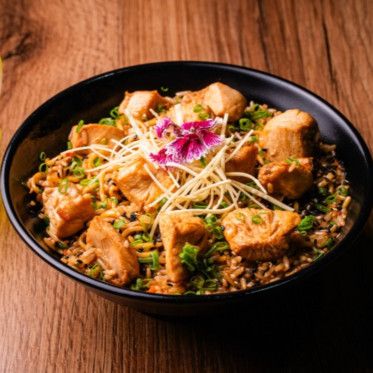 Platillo a base de arroz frito al wok, pollo, huevo y vegetales estilo japonés