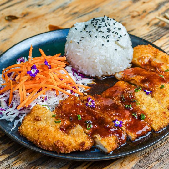 Base de arroz sushi, chicken crispy, zanahoria, col, palta y crunchy de wantan.