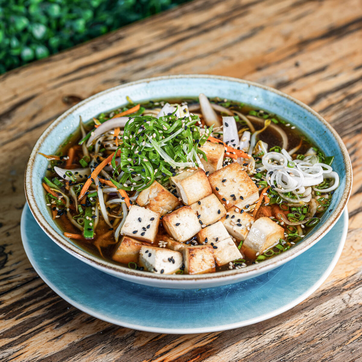 Base de caldo estilo japonés, fideos ramen, holantao, frijol chino , cebolla salteada y tofu. Instrucciones espe