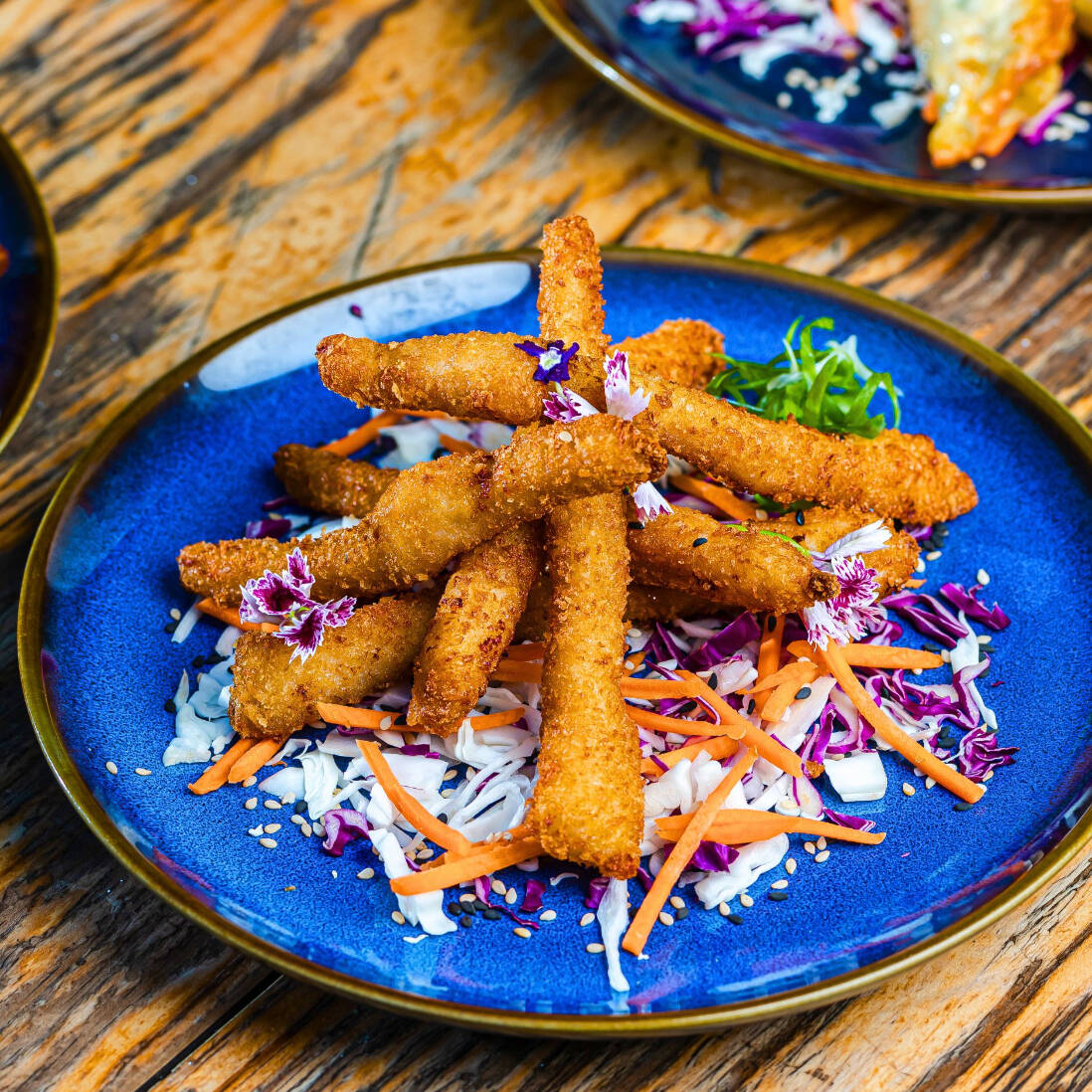 6 cortes: Relleno de tofu furai y palta, bañada en salsa acevichada e hilos de camote frito.