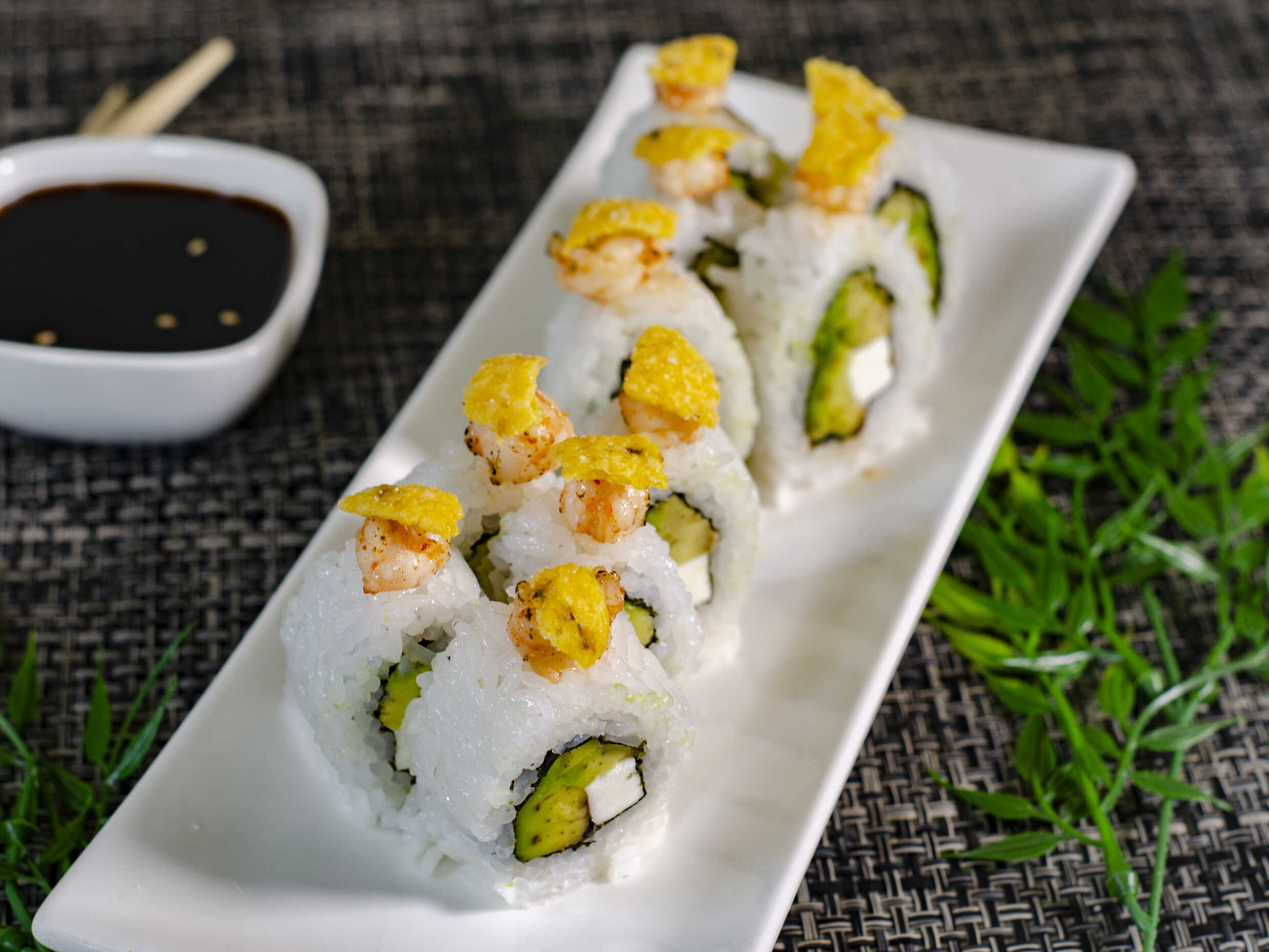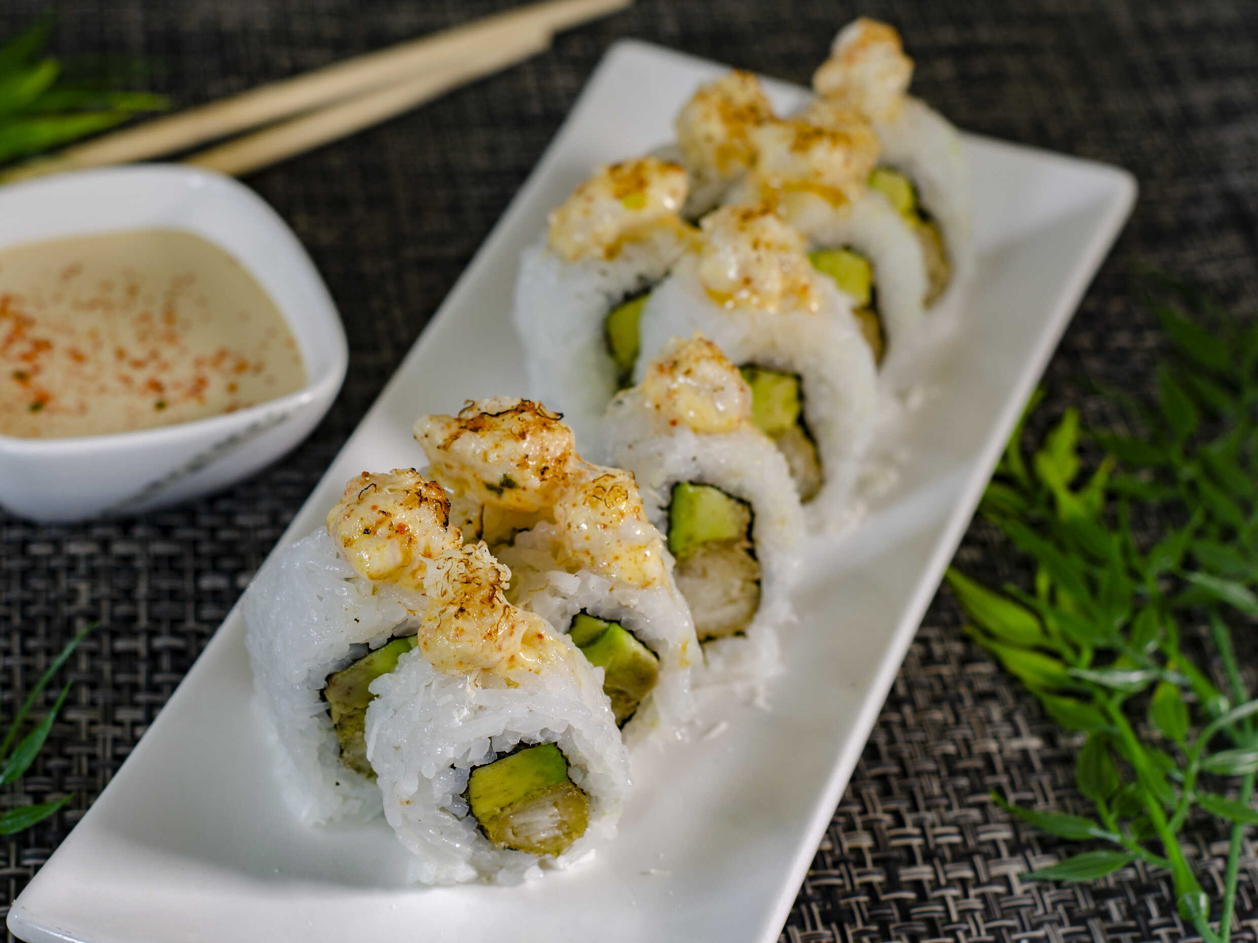 Relleno de ebi furai y palta. Cubierta de pescado del día, toques de togarashi y cebolla china. Elige la salsa que más te guste.