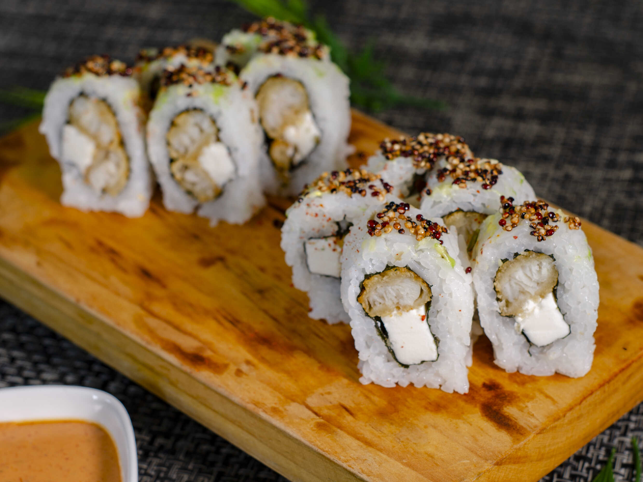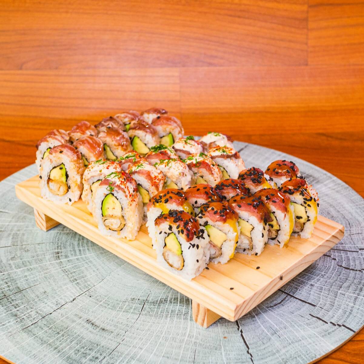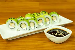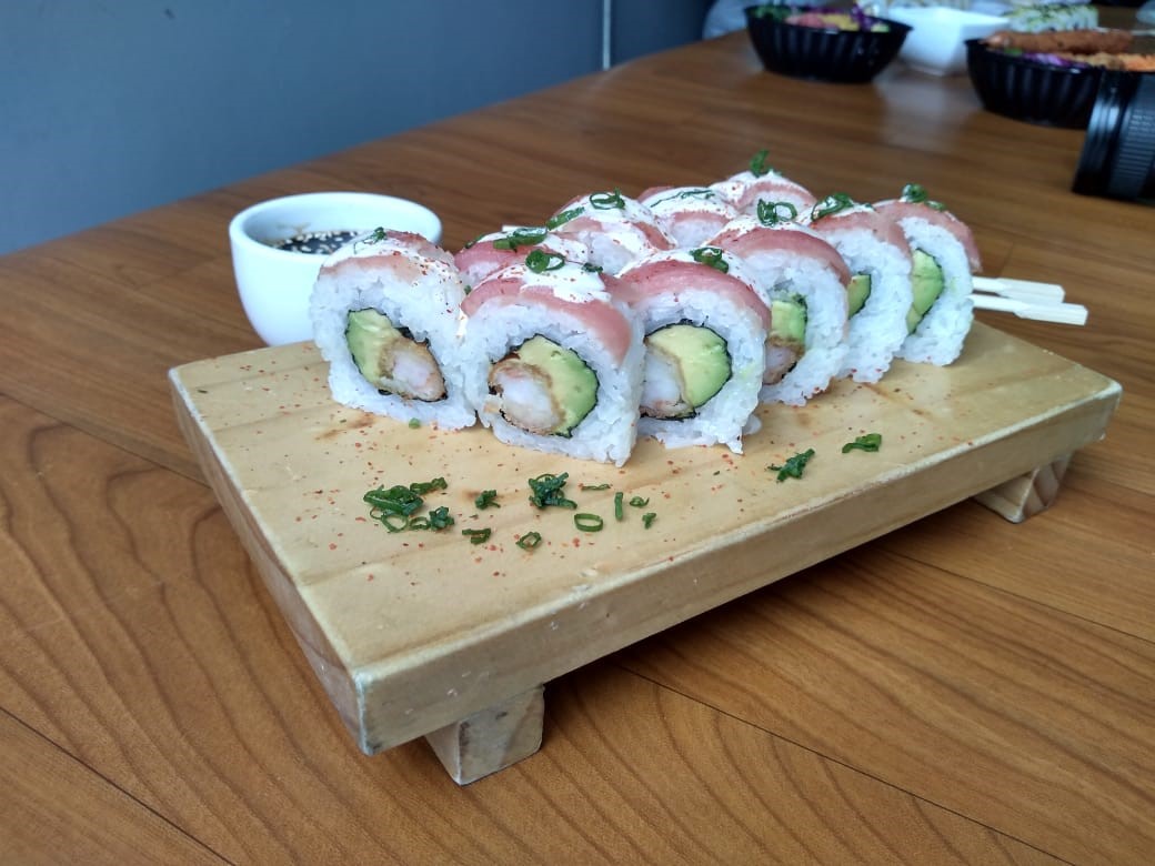 Relleno de ebi furai, palta y queso crema. Cubierta de pescado del día con toques de mayonesa y flambeado, al final bañado en salsa de mago y ajonjolí negro. Elige la salsa que más te guste.