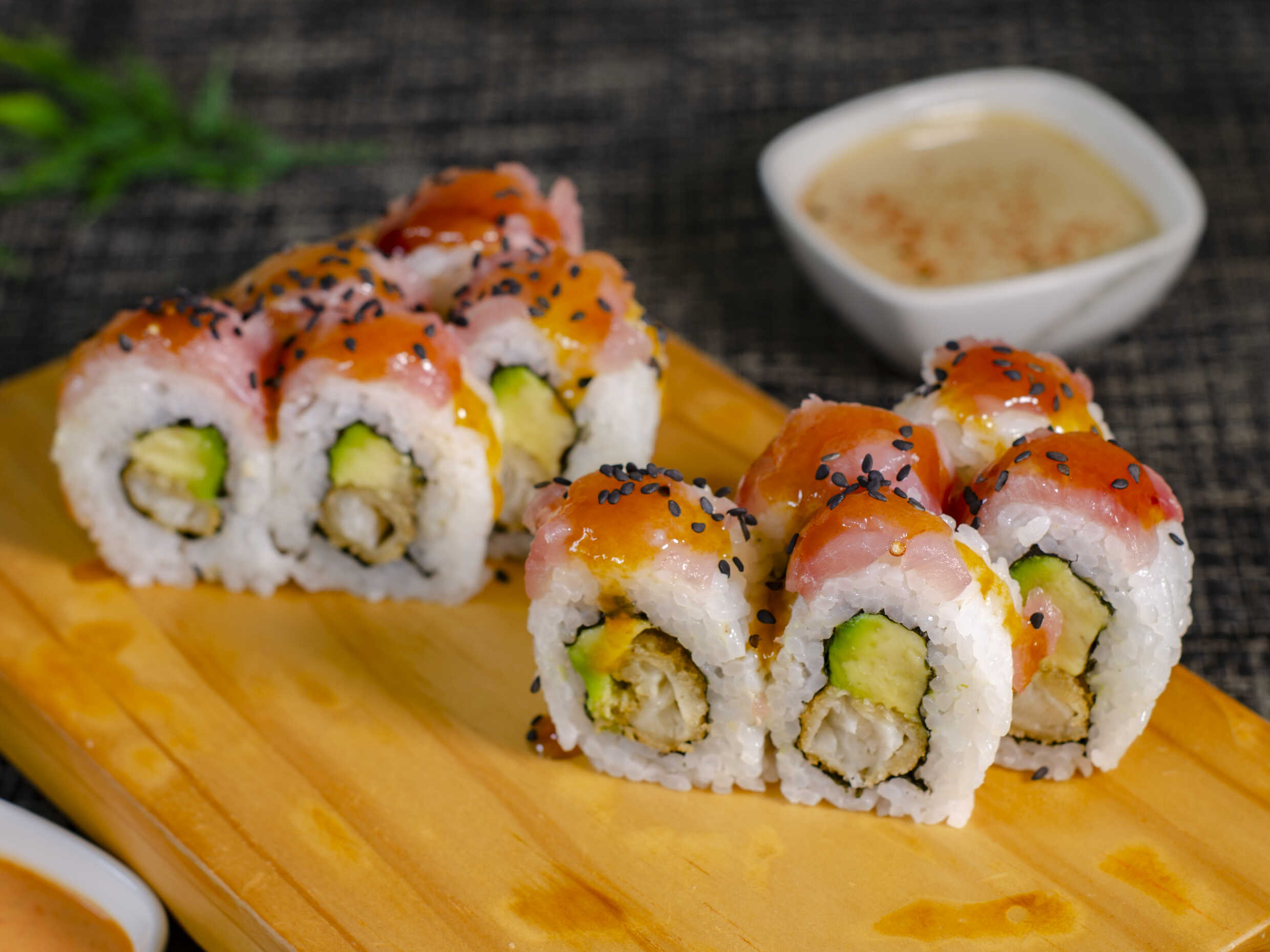 Relleno de ebi furai y palta. Cubierta de pescado del día en toques de mantequilla y flambeado, bañado en salsa anguila y ajonjolí blanco. Elige la salsa que más te guste.