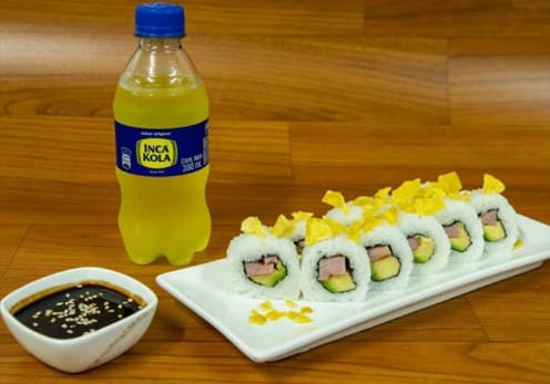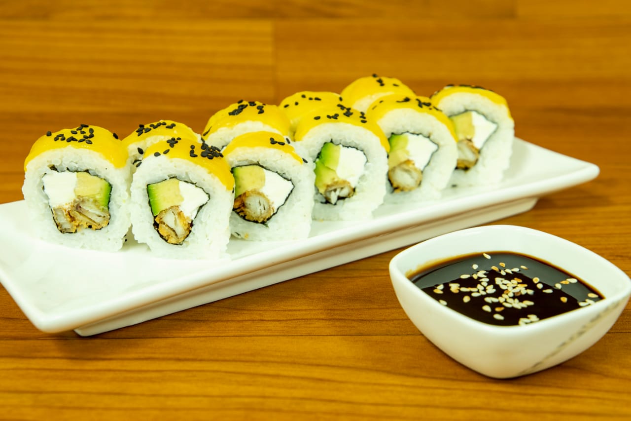 Relleno de sakana furai y palta. Cubierta de pescado del día bañado en salsa de mango o maracuyá (de acuerdo al stock) . Elige la salsa que más te guste.